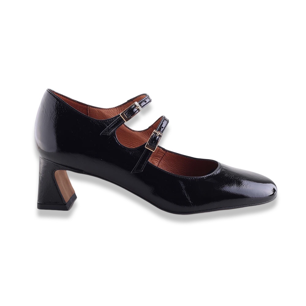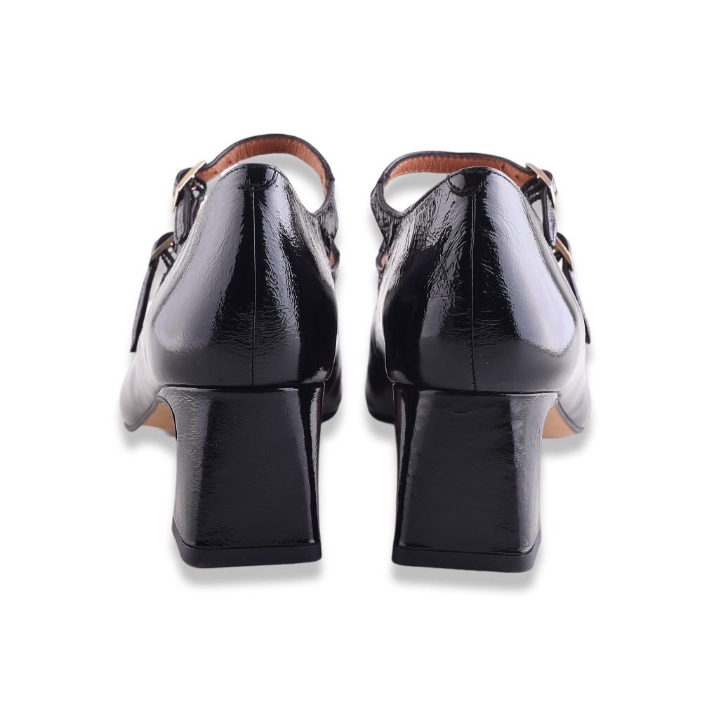 Décolleté in pelle verniciata con sottopiede leggermente imbottito in pelle. Tacco geometrico molto comodo e doppio laccetto sul collo del piede regolabile.  Fondo in gomma.