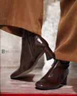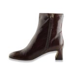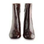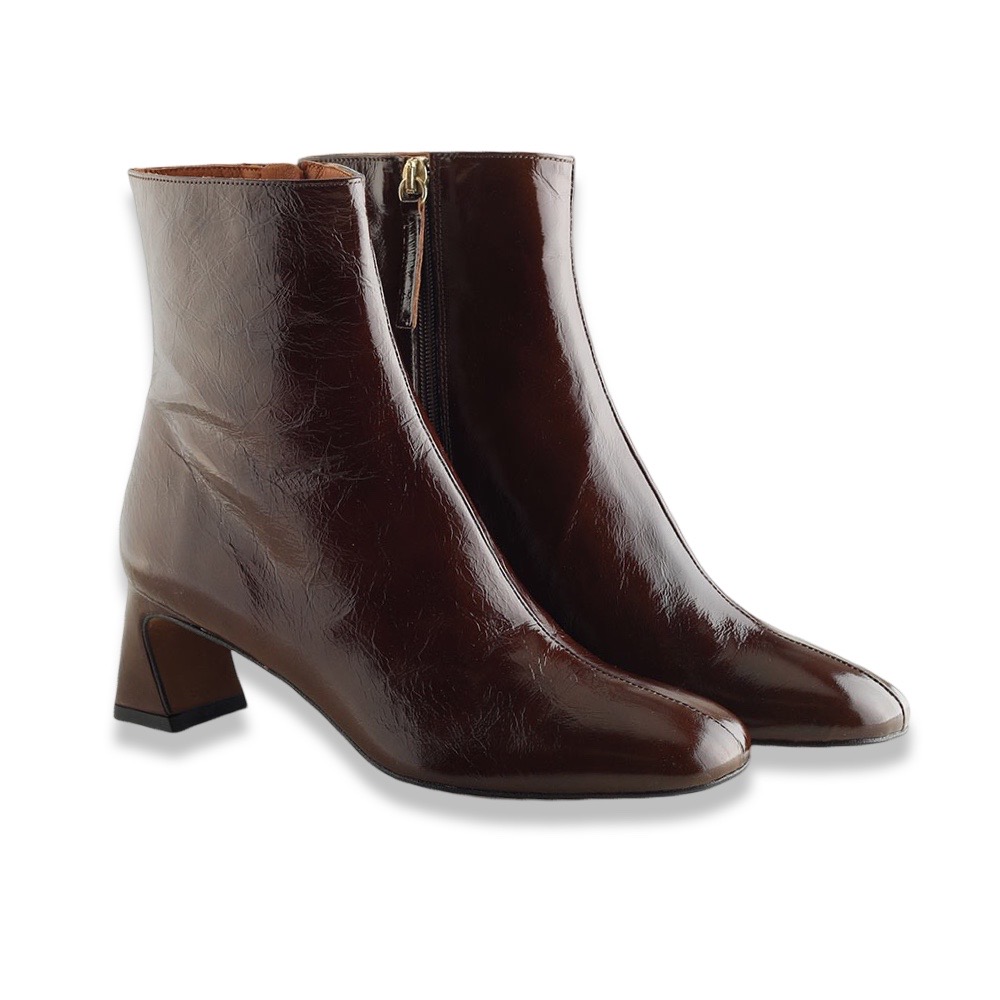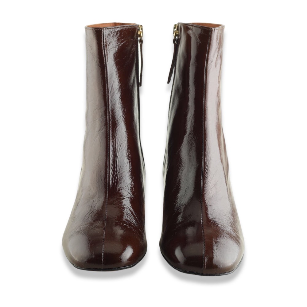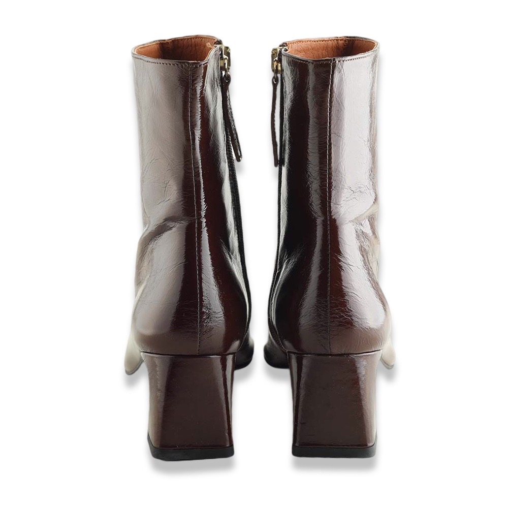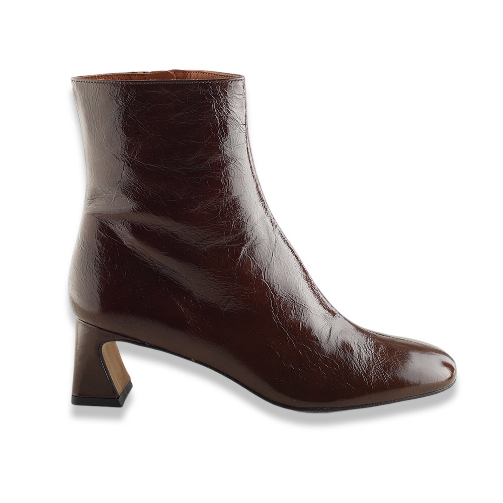 Tronchetto punta stondata in pelle verniciata con tacco geometrico, zip laterale e sottopiede in pelle leggermente imbottito. Fondo in gomma.