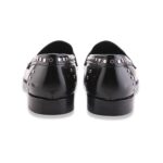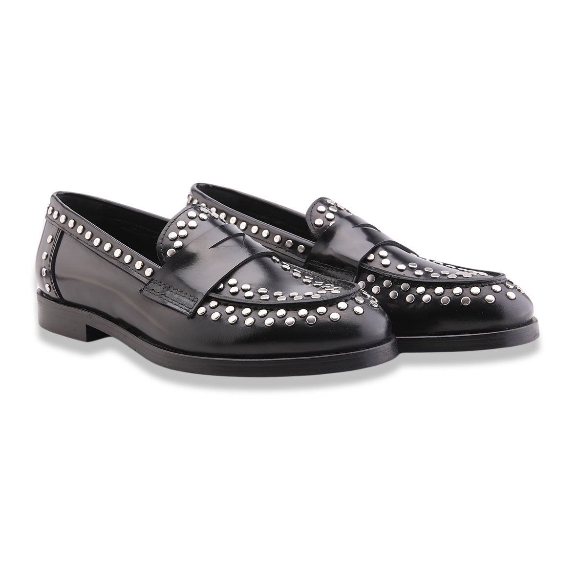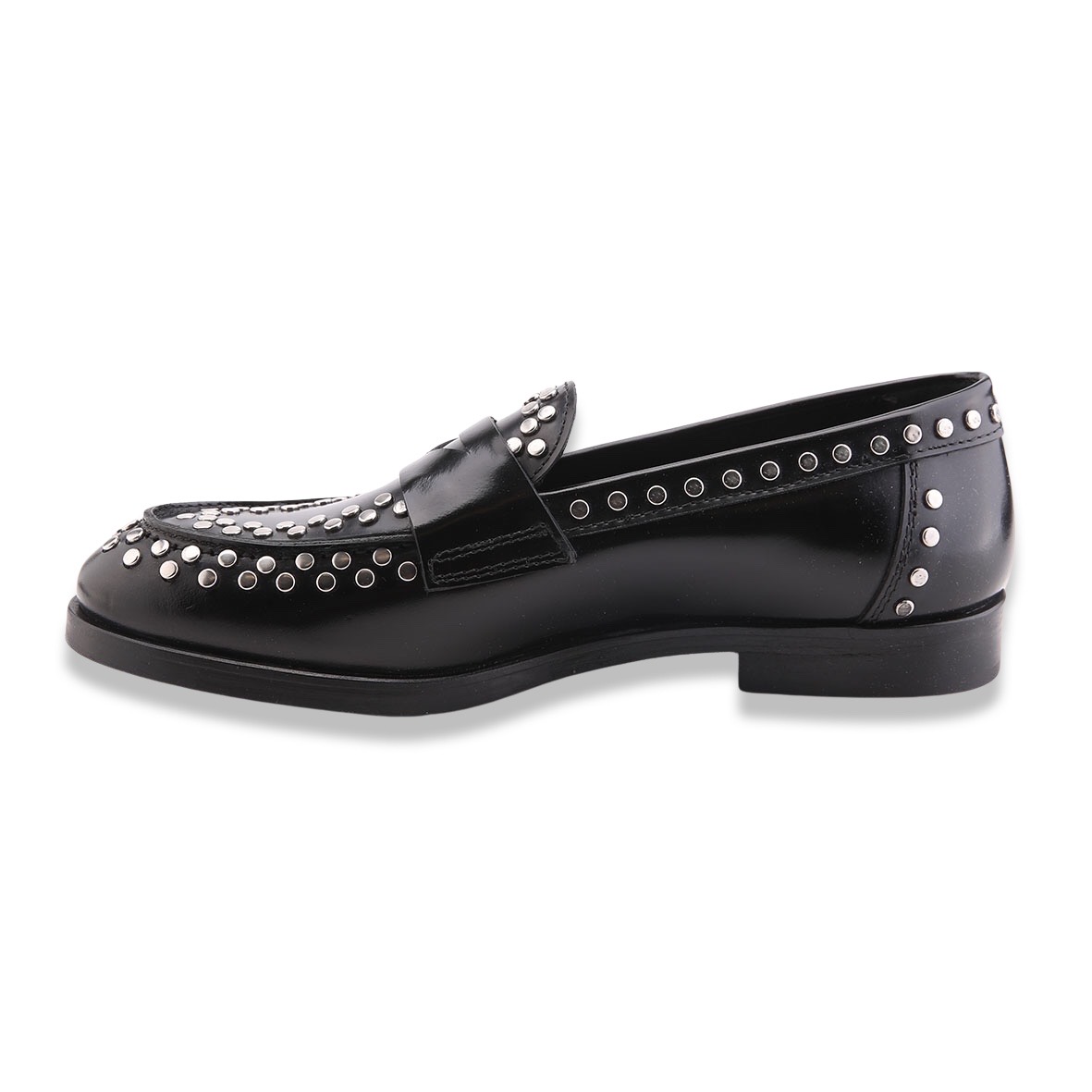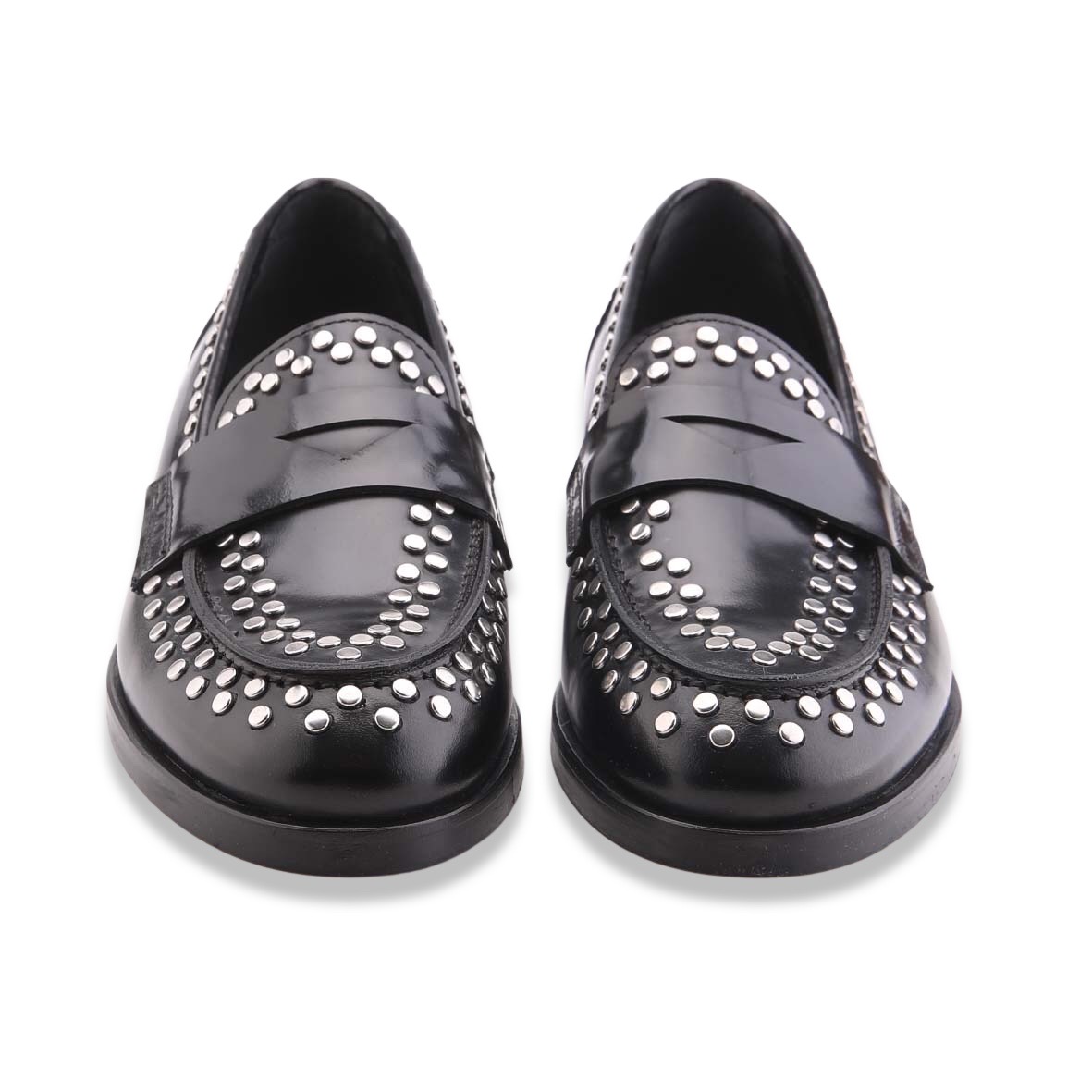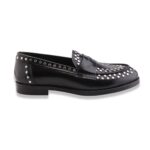 Mocassino stile maschile interamente in pelle, tomaia in abrasivato impreziosita da mascherina porta penny e borchie. Cucitura sul davanti e fondo in cuoio e gomma. Made in Italy