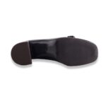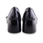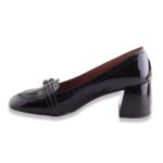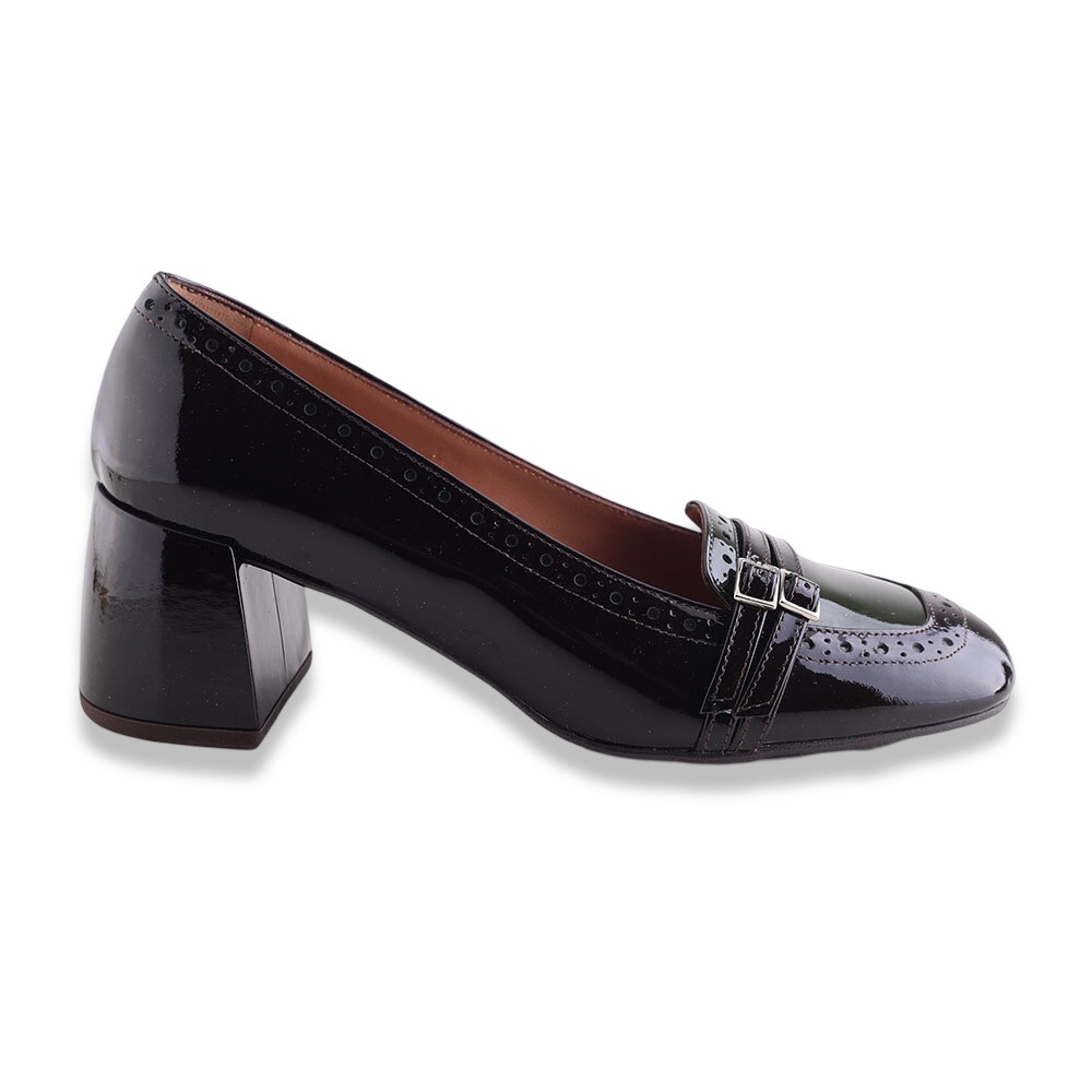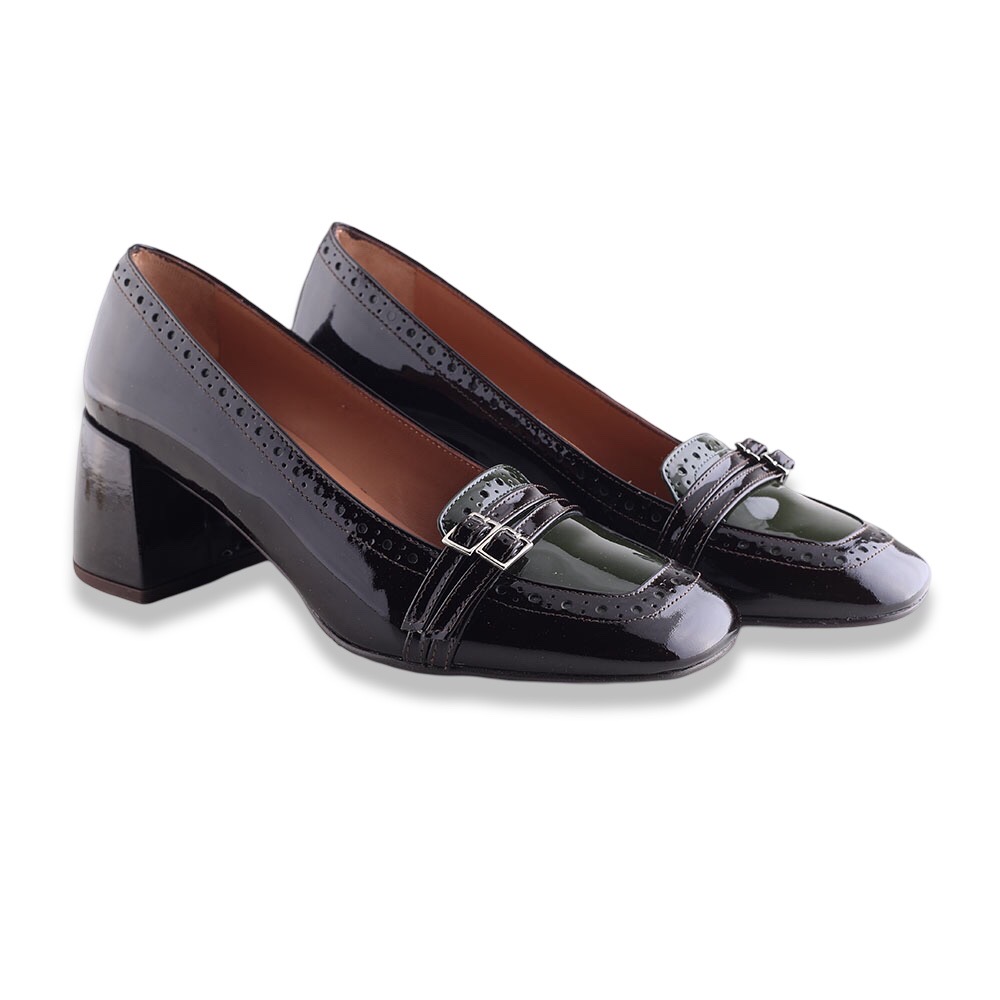 Décolleté squadrato in pelle verniciata bicolor con lavorazione all’inglese su bordi. Tacco molto comodo e fibiette sulla punta. Fondo in gomma. Made in Italy