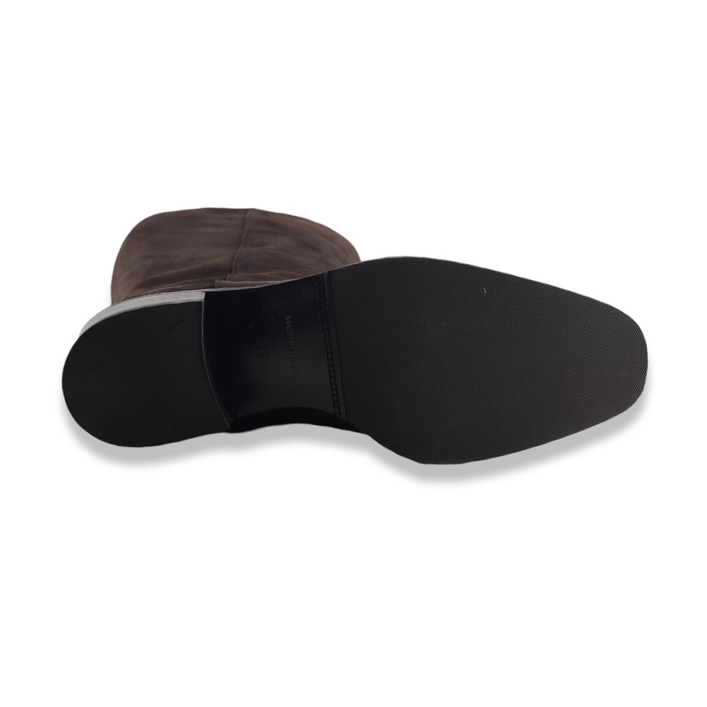 Stivale in camoscio con gambale tubolare con punta bombata. Sottopiede in pelle e fondo in gomma. Made in Italy