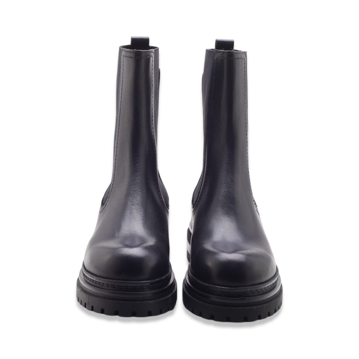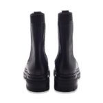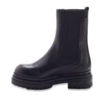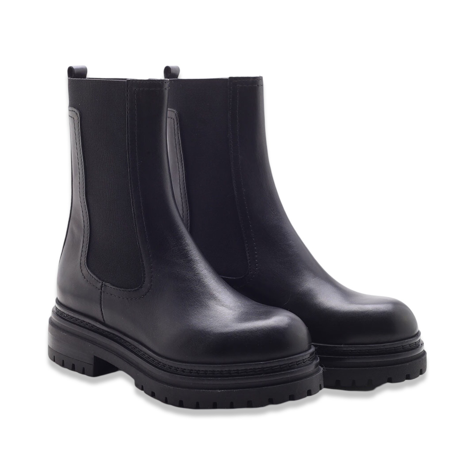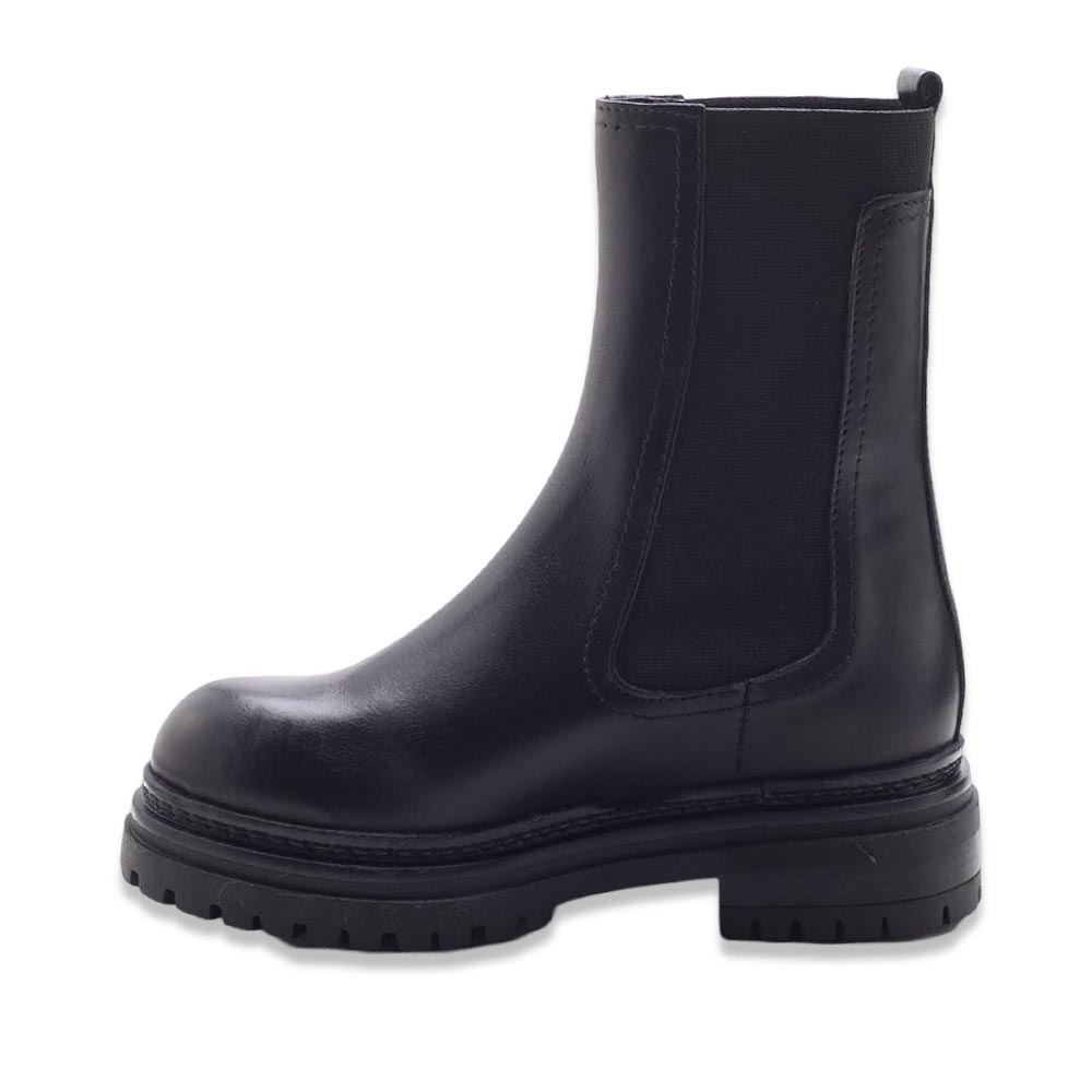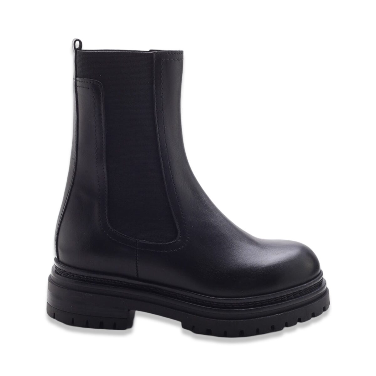 Boots in pelle con pannelli elasticizzati laterali e fettuccia posteriore. Suola carrarmato in gomma di colore nero.