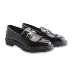 Mocassino stile maschile interamente in pelle, tomaia in abrasivato impreziosita da accessorio con morsetto color oro e frangia. Fondo in gomma. Made in Italy