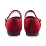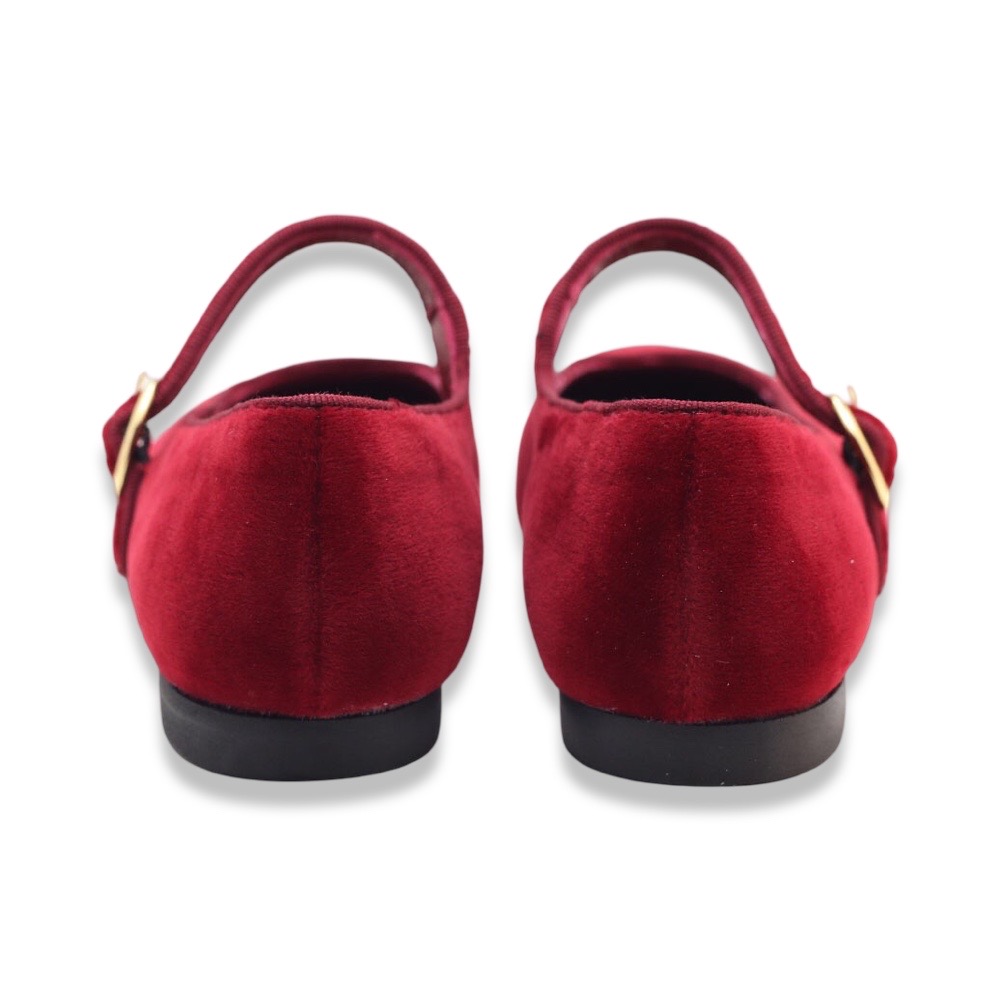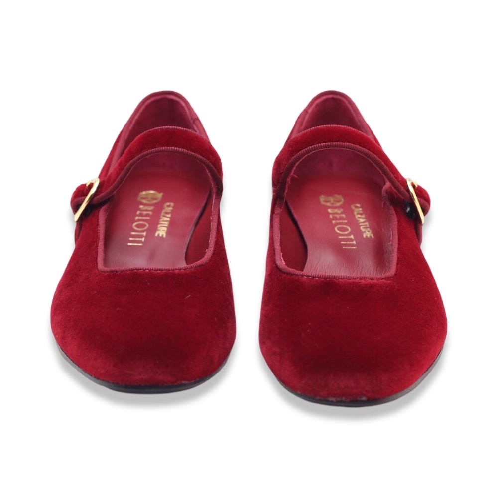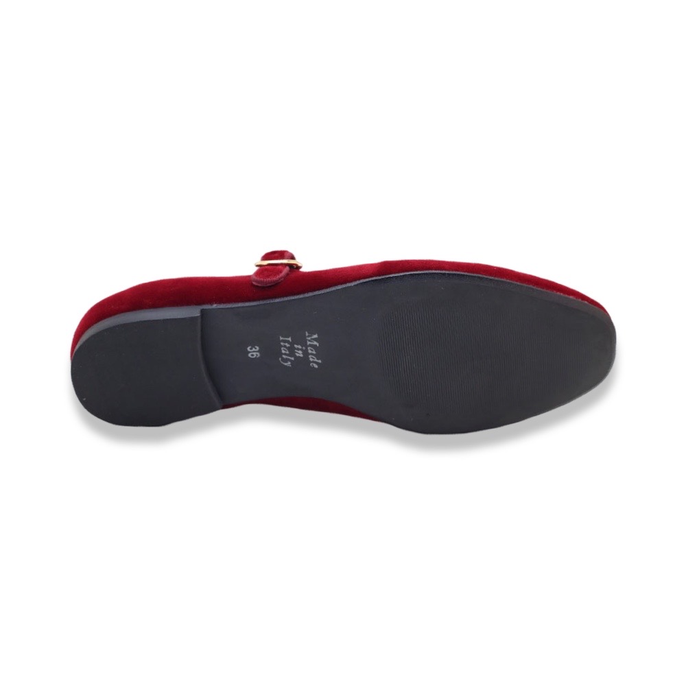 Pantofolina in velluto con interno in pelle e bordino in tessuto. Cinturino sul collo del piede regolabile e fondo in gomma. Made in Italy