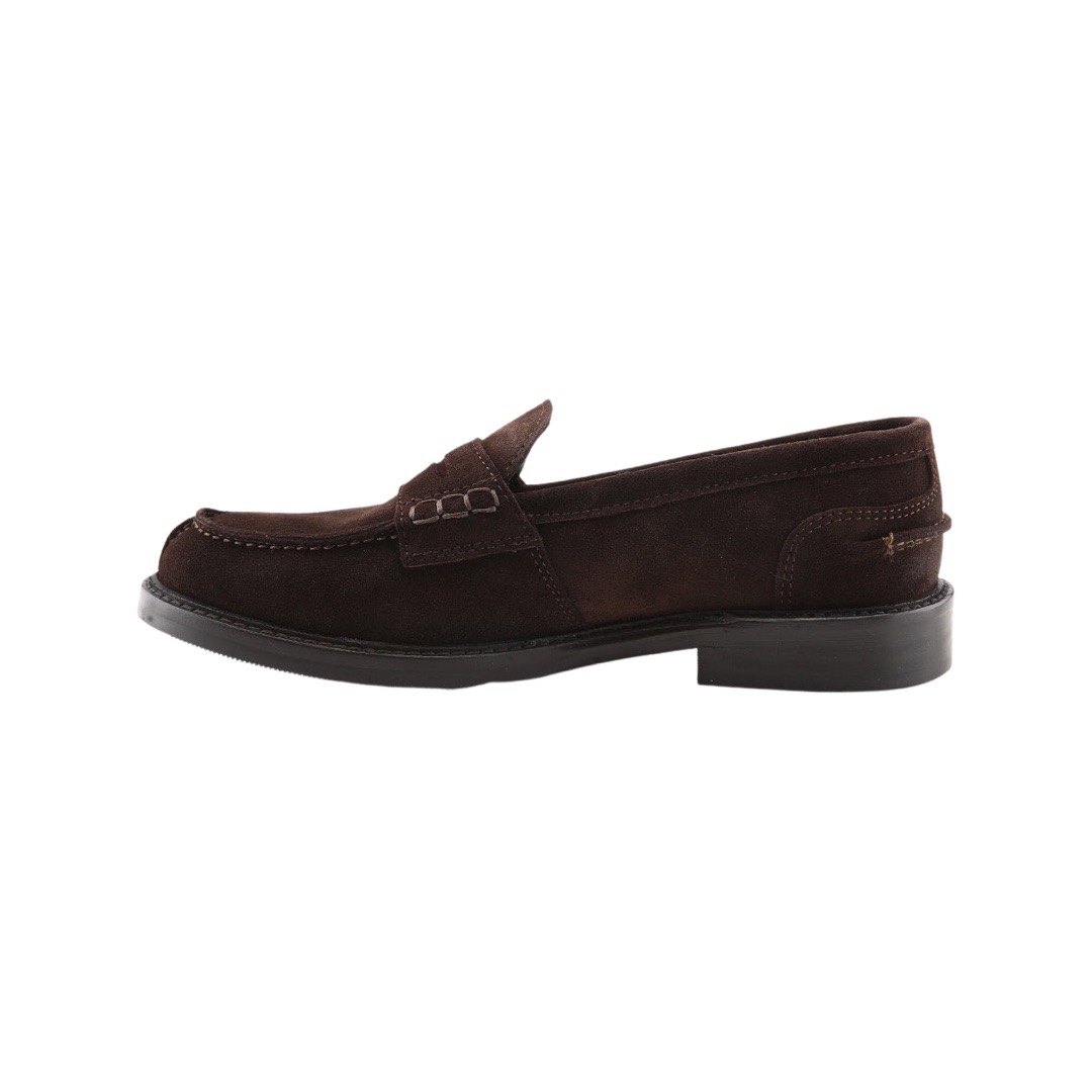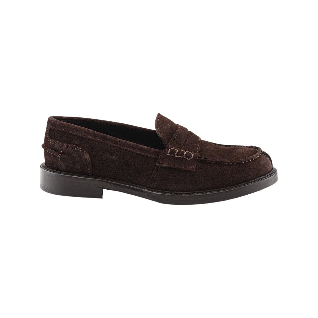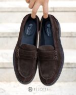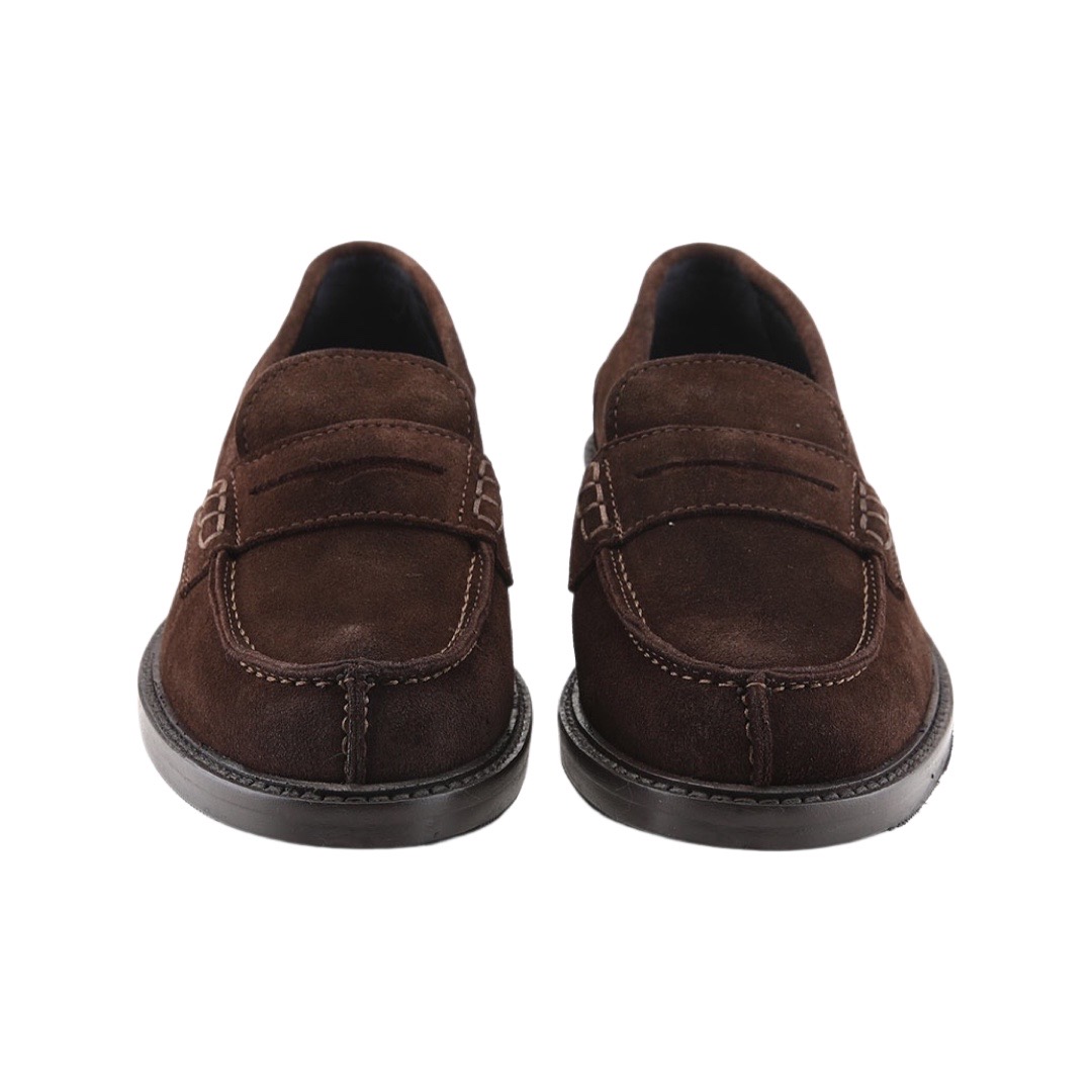 Mocassino stile maschile  interamente in pelle, tomaia in camoscio impreziosita da mascherina porta penny. Cucitura sul davanti e fondo in cuoio e gomma. Made in Italy