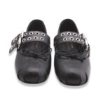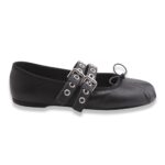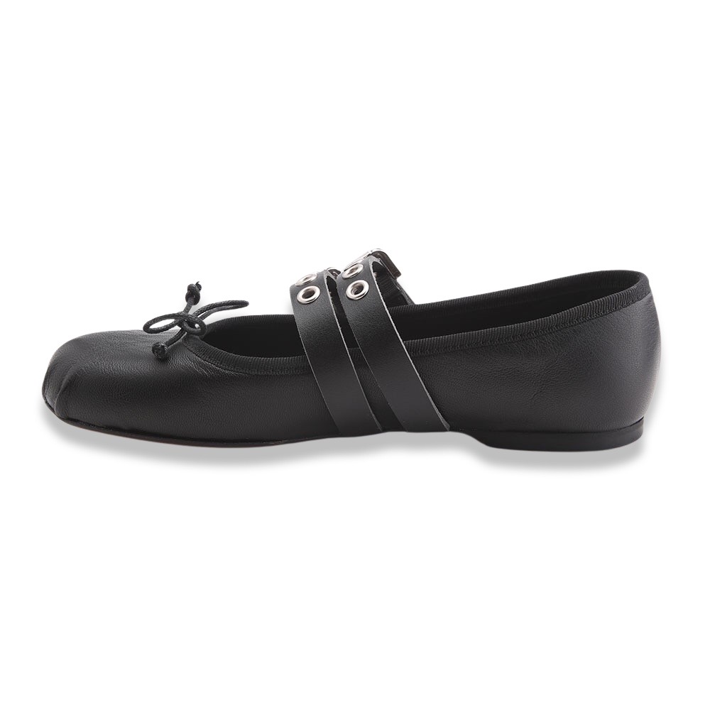 Ballerina grintosa in pelle con punta tonda arricciata, nastrino in tinta con fiocchetto e due cinturini sul collo del piede regolabili. Fondo in gomma. Made in Italy