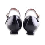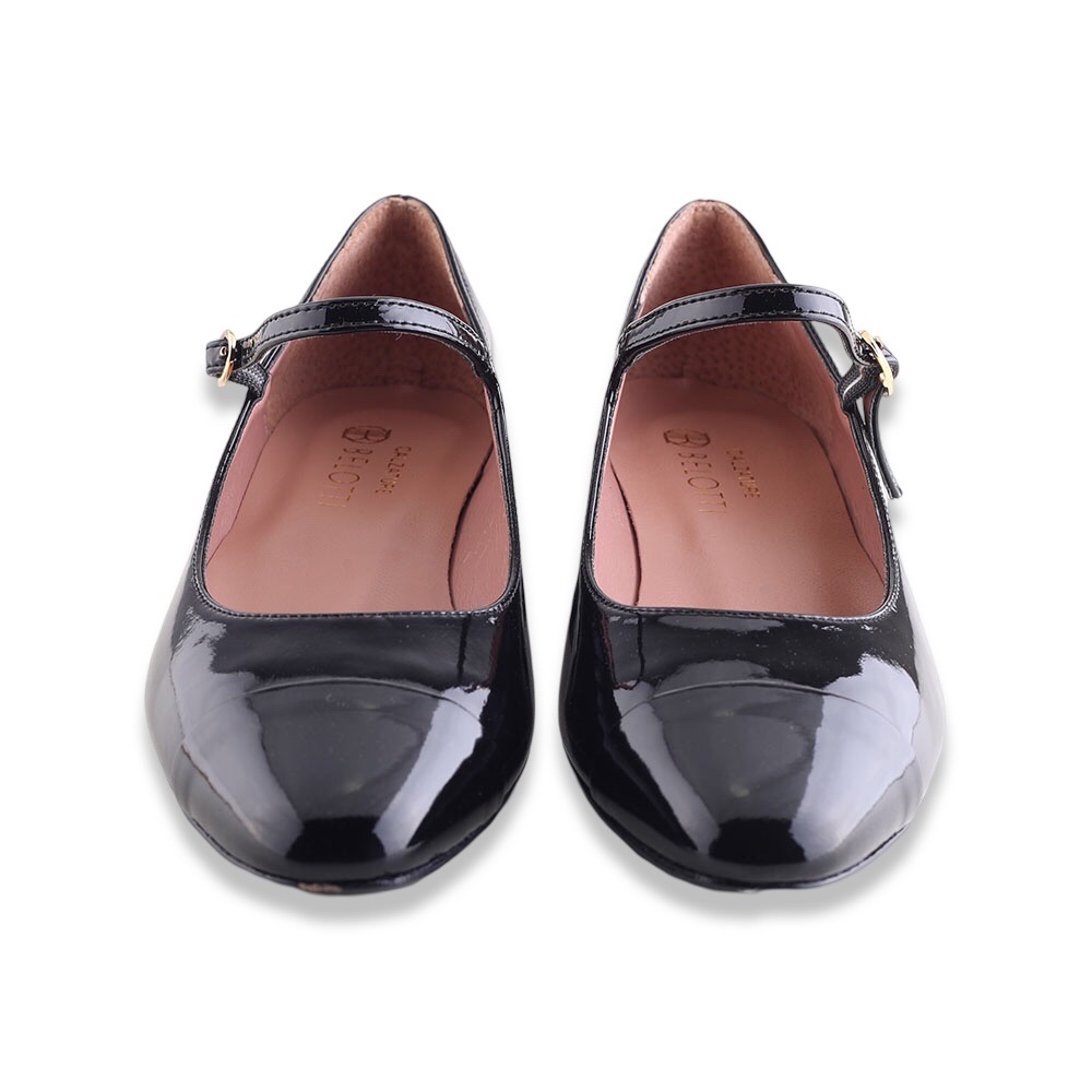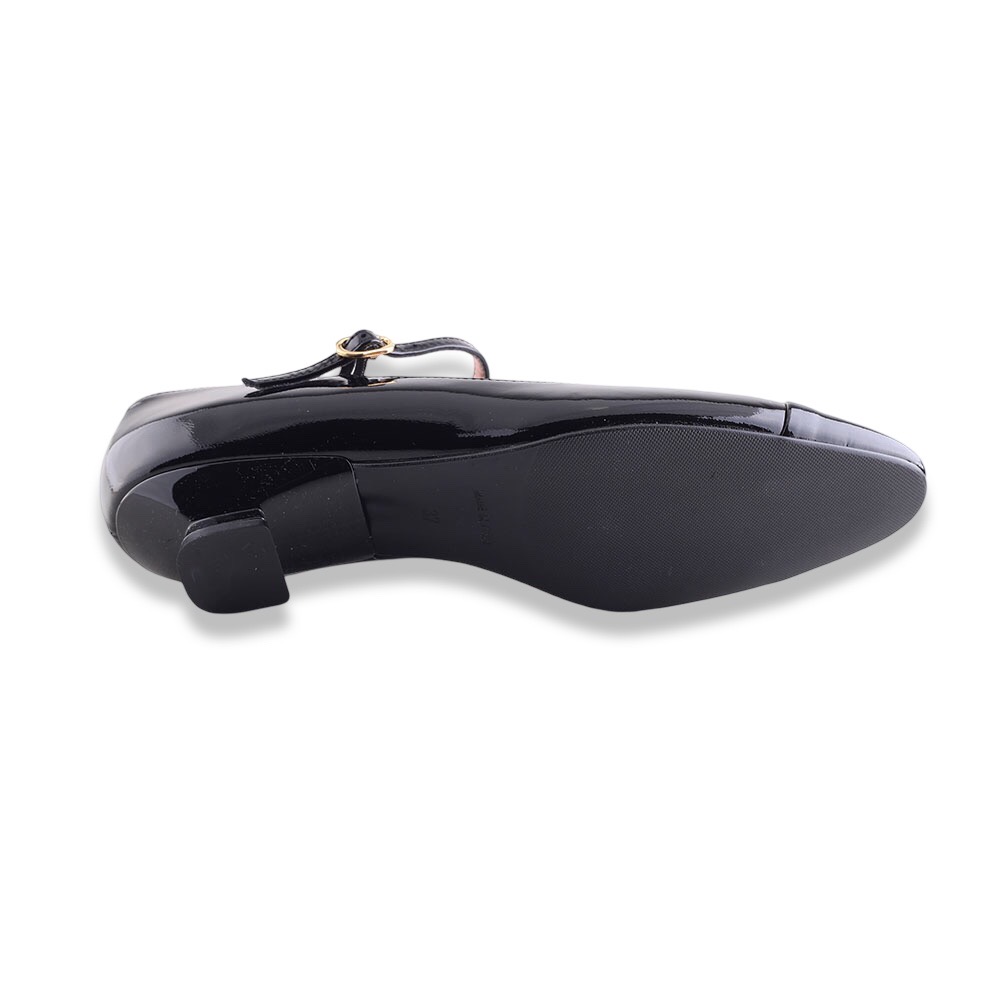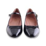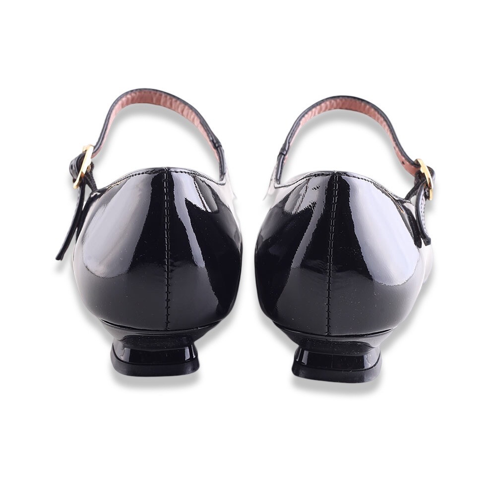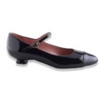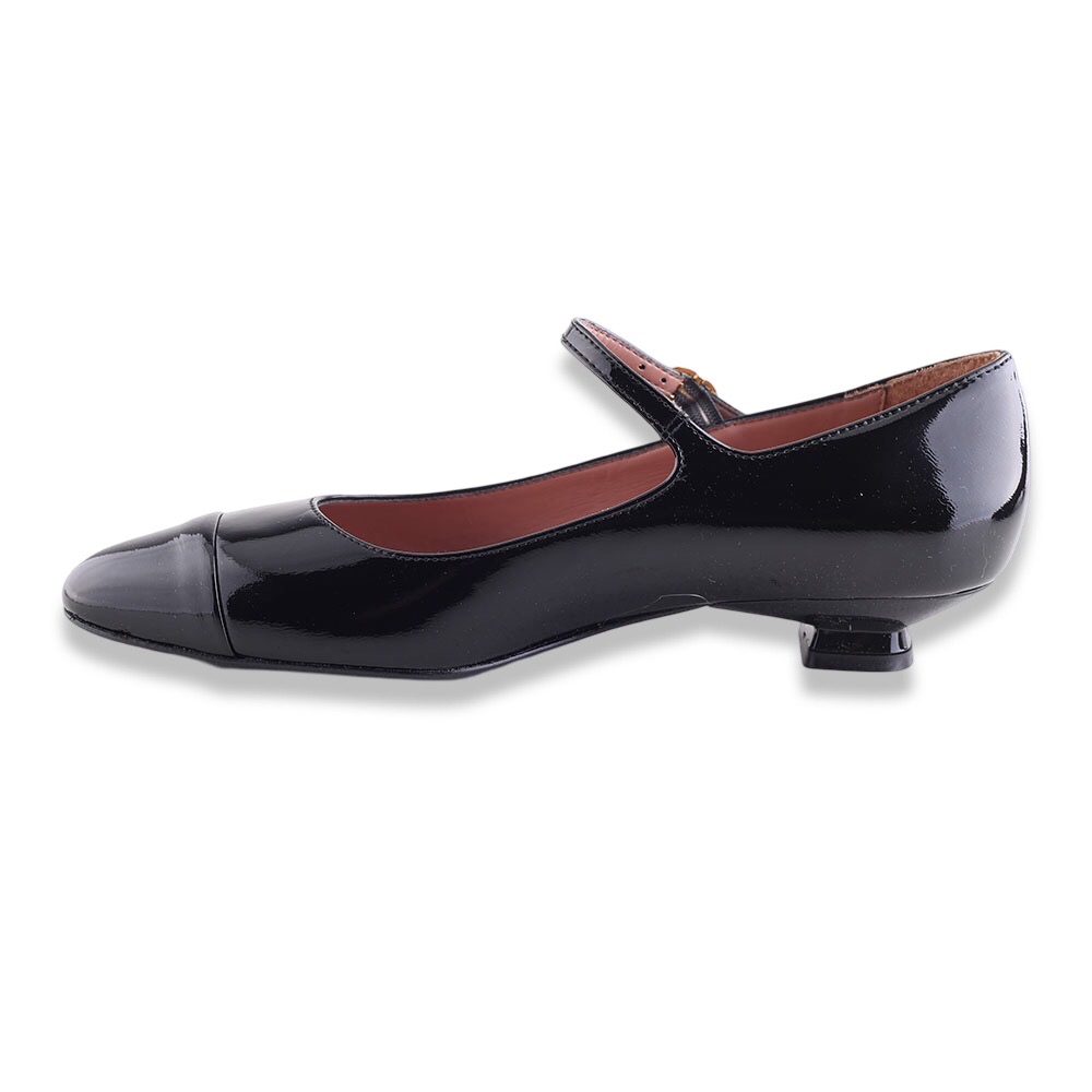 Décolleté in pelle verniciata con punta a in tinta colore. Tacco molto particolare e laccetto alla caviglia regolabile.  Fondo in gomma. Made in Italy.