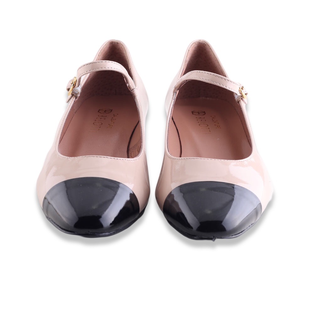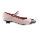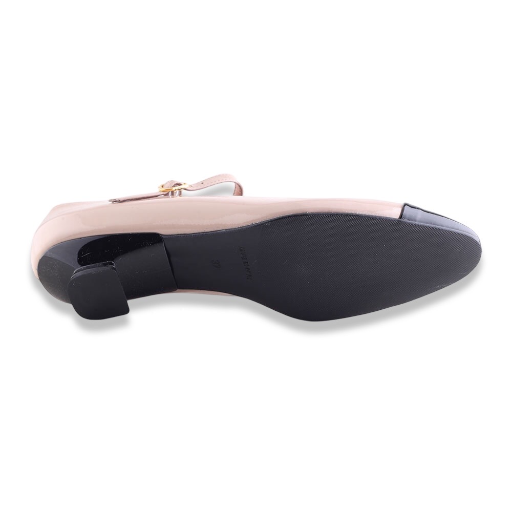 Décolleté in pelle verniciata con punta a contrasto colore. Tacco molto particolare e laccetto alla caviglia regolabile.  Fondo in gomma. Made in Italy.