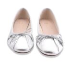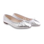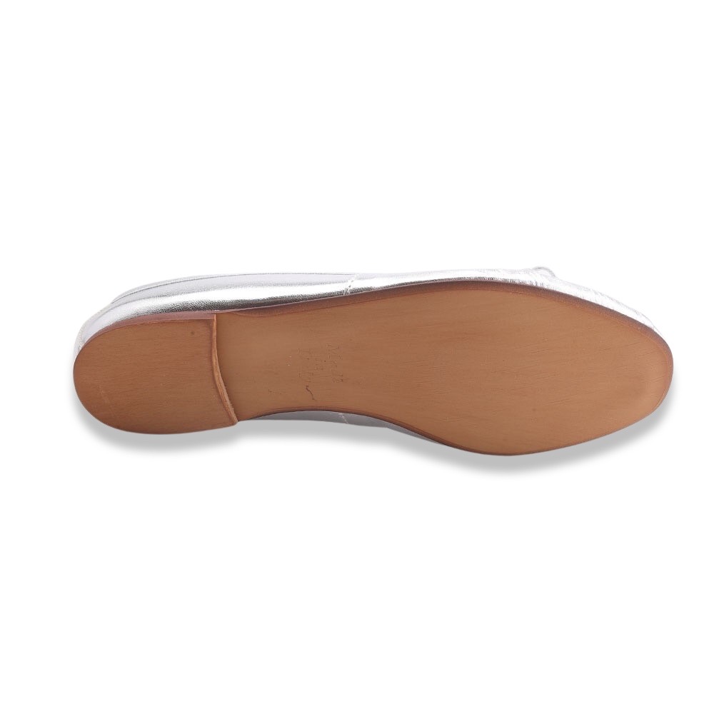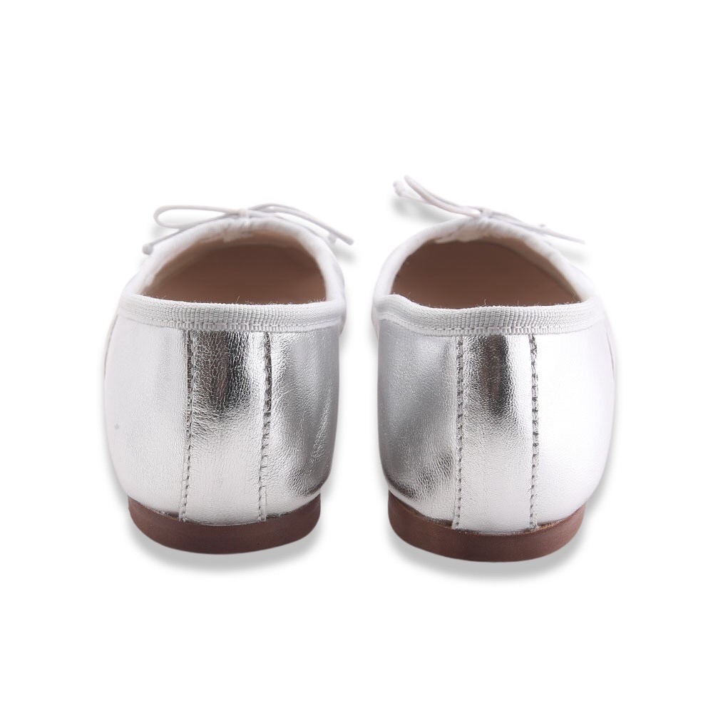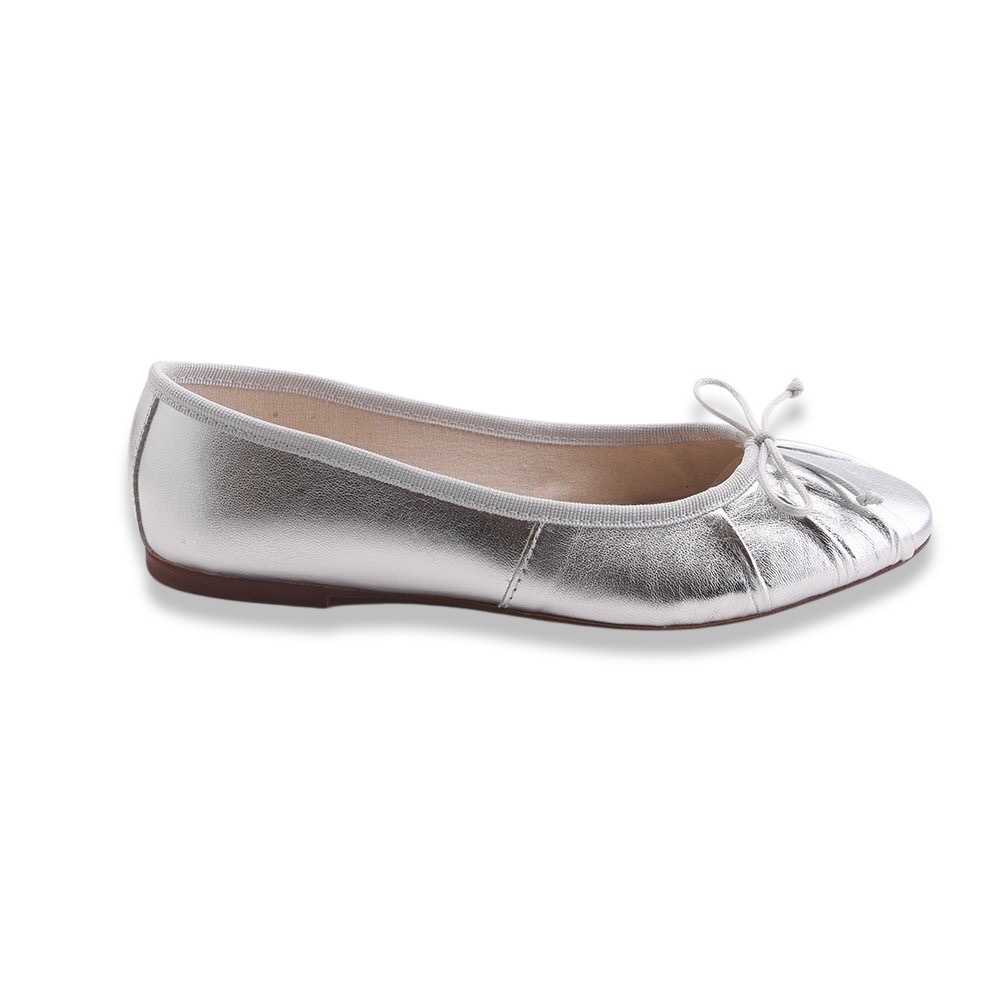 Ballerina classica in pelle, bordino in tessuto in tinta e punta tonda arricciata con fiocchetto. Fondo in gomma.