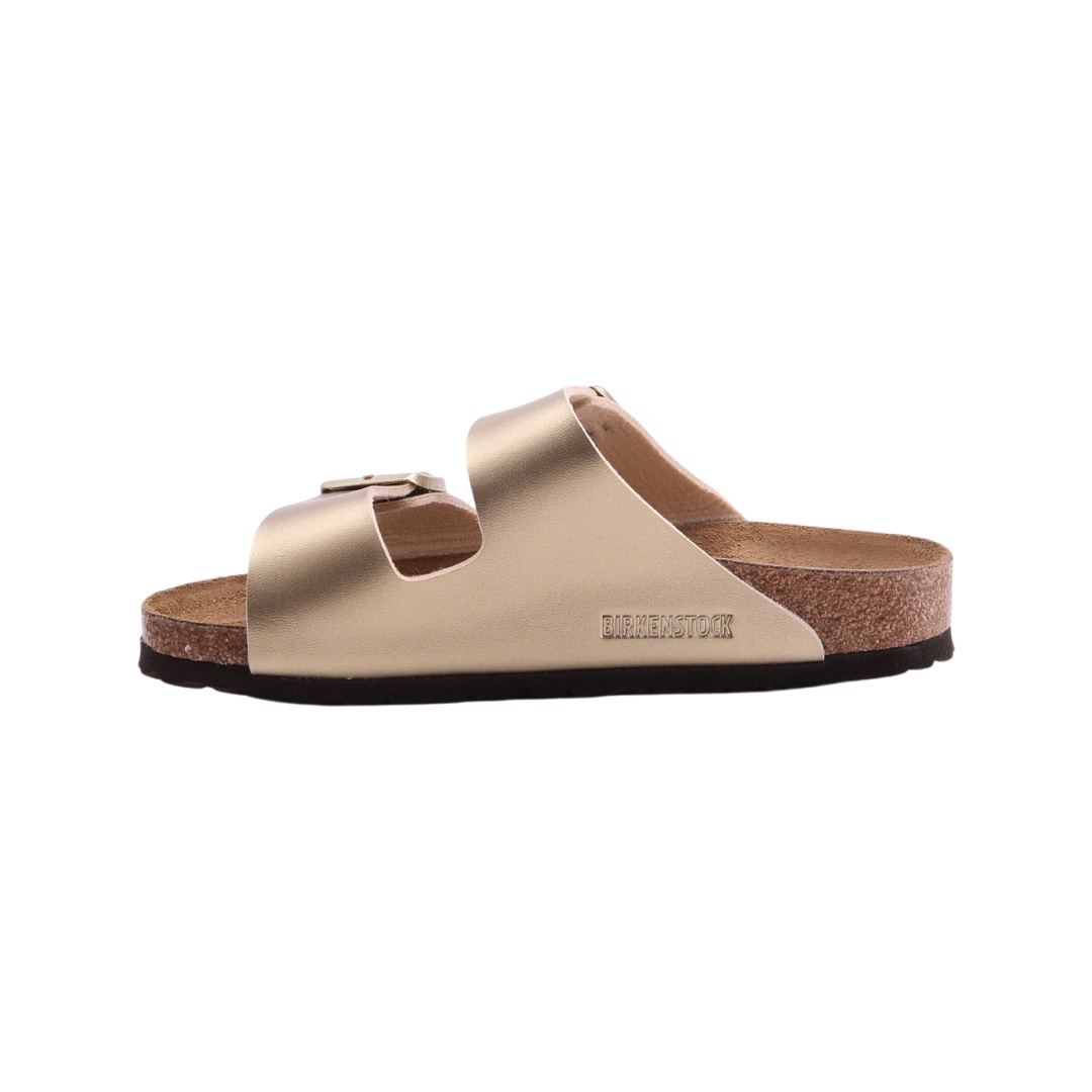 Le Birkenstock Arizona in finitura dorata sono la scelta perfetta per chi desidera unire il comfort iconico del brand a un tocco glamour. Il design intramontabile a doppia fascia si rinnova con un effetto metallizzato elegante, ideale per valorizzare ogni outfit estivo.