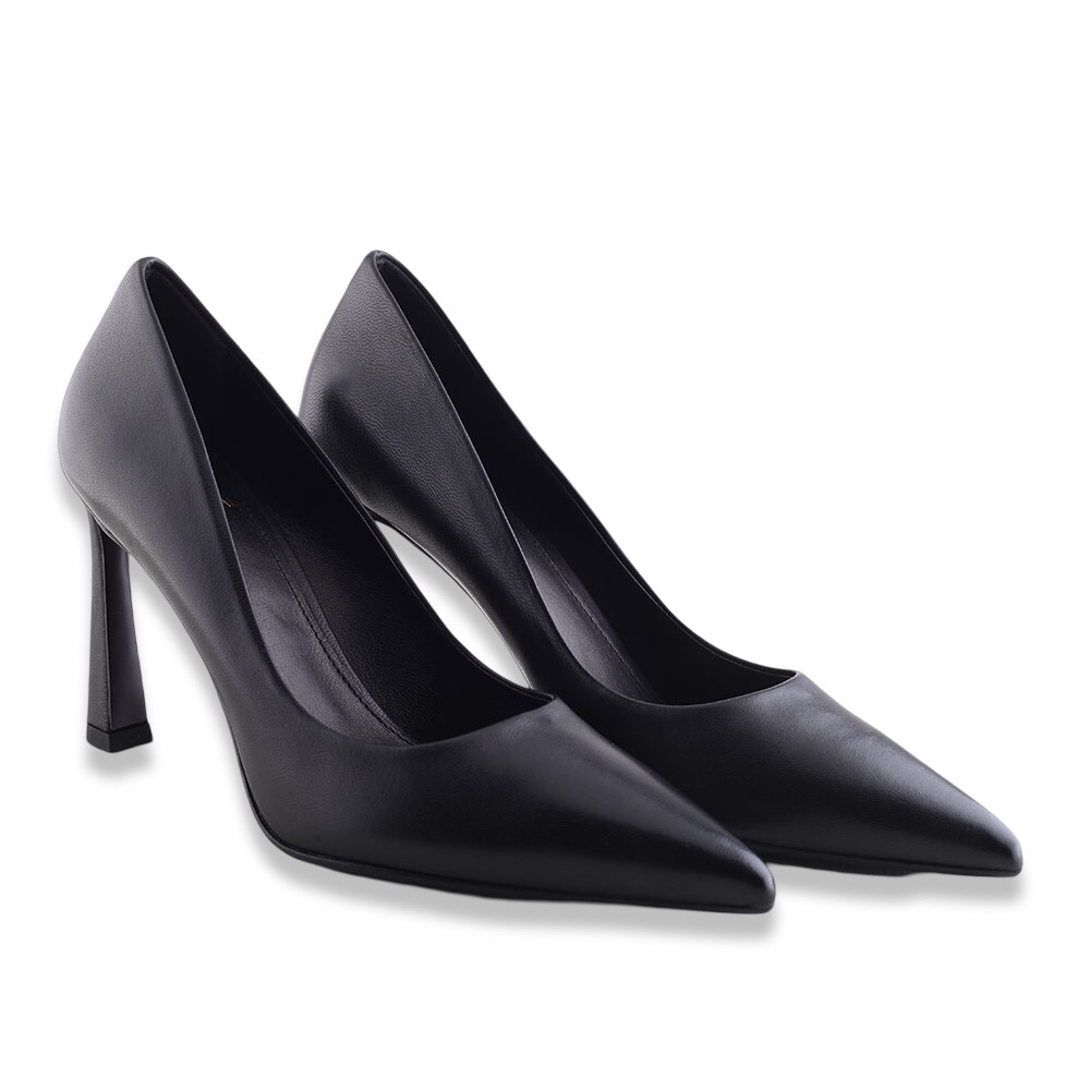 Décolleté sfilato interamente in pelle di colore nero classico con tacco particolare. Soletta interna in pelle e fondo in vero cuoio e gomma. Made in Italy.