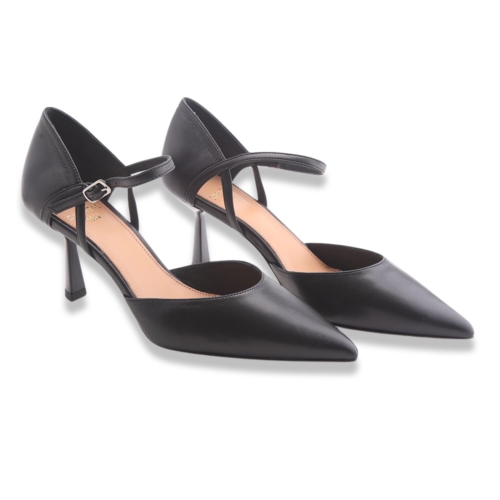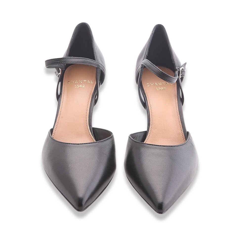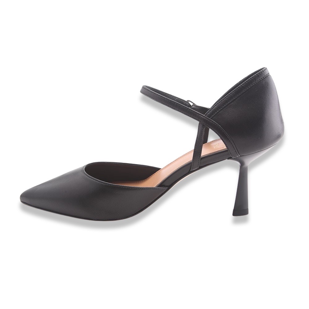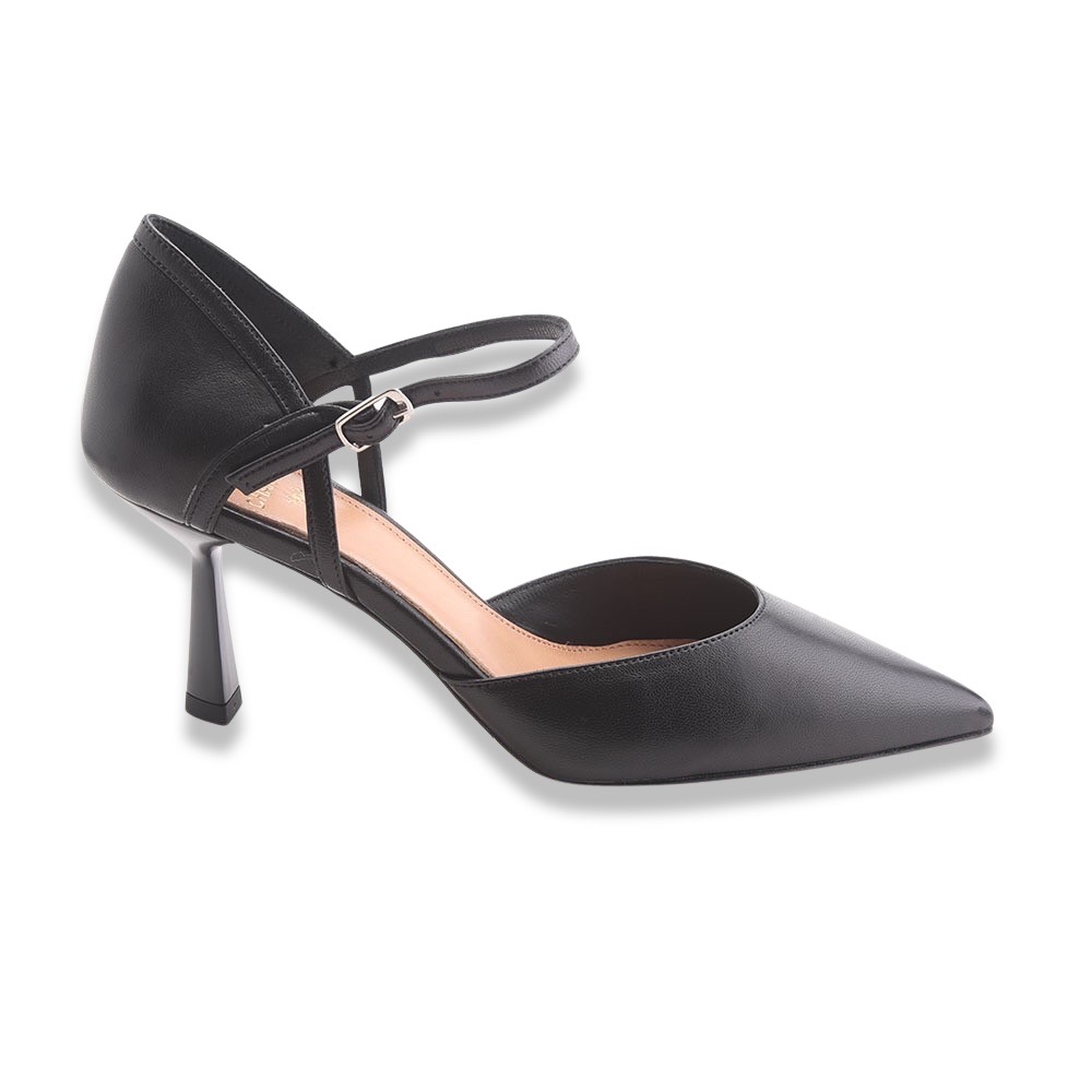 Décolleté sfilato molto particolare interamente in pelle  con sottopiede leggermente imbottito. Apertura sui lati e laccetto alla caviglia regolabile. Fondo in cuoio. Made in Italy