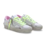 🔹 Design Esclusivo: La tomaia in pelle bianca è arricchita da inserti glitterati, scritte a mano e dettagli metallici per un effetto urban-glam.