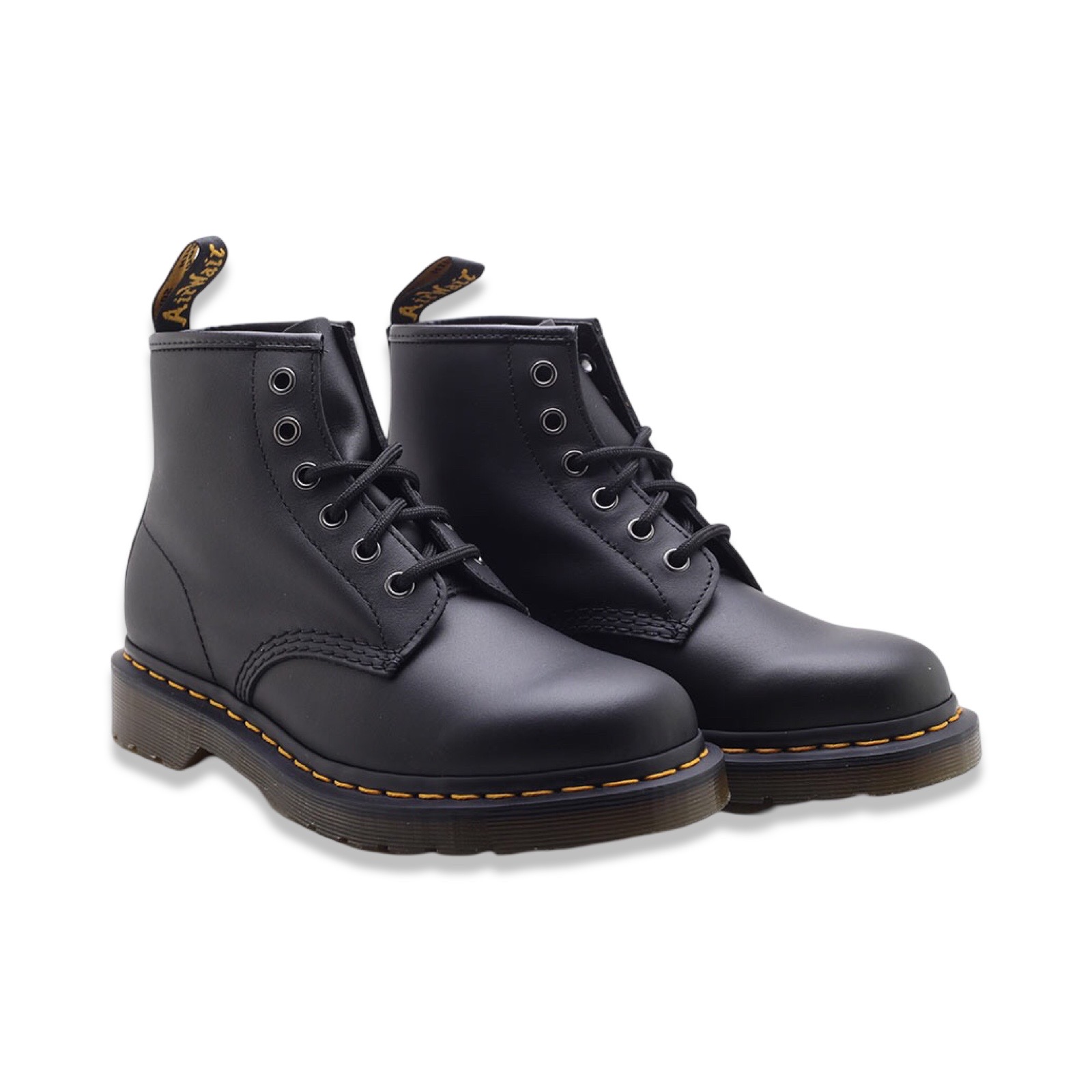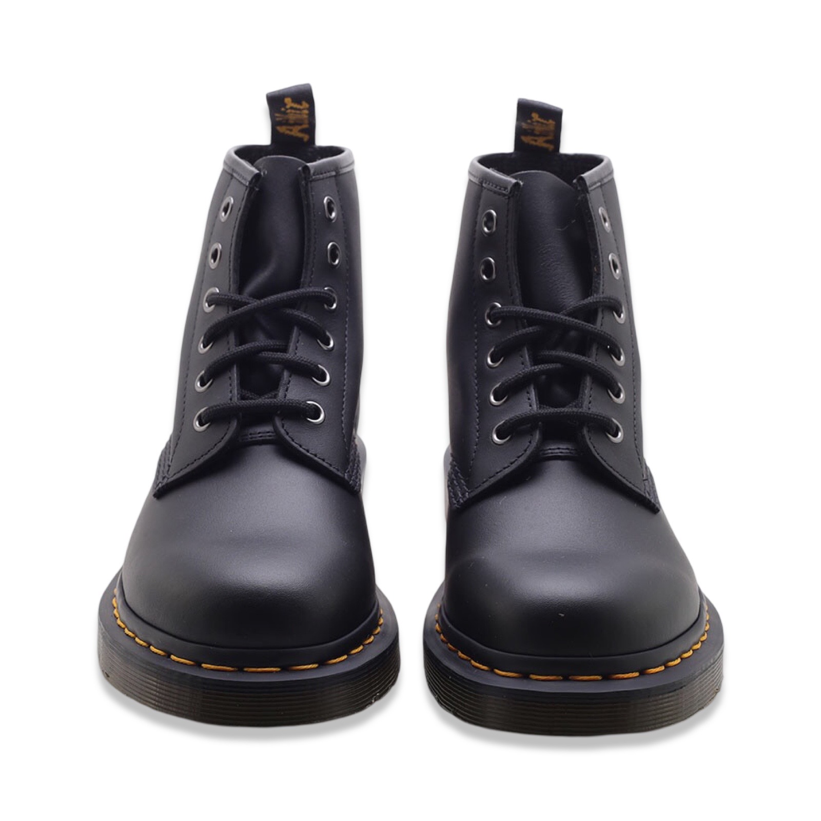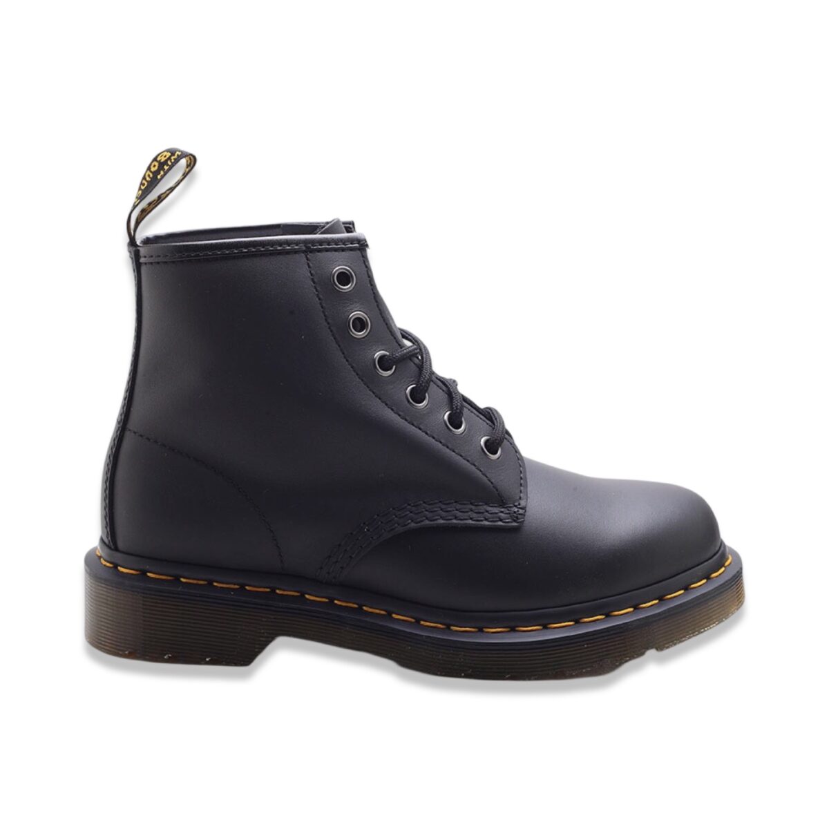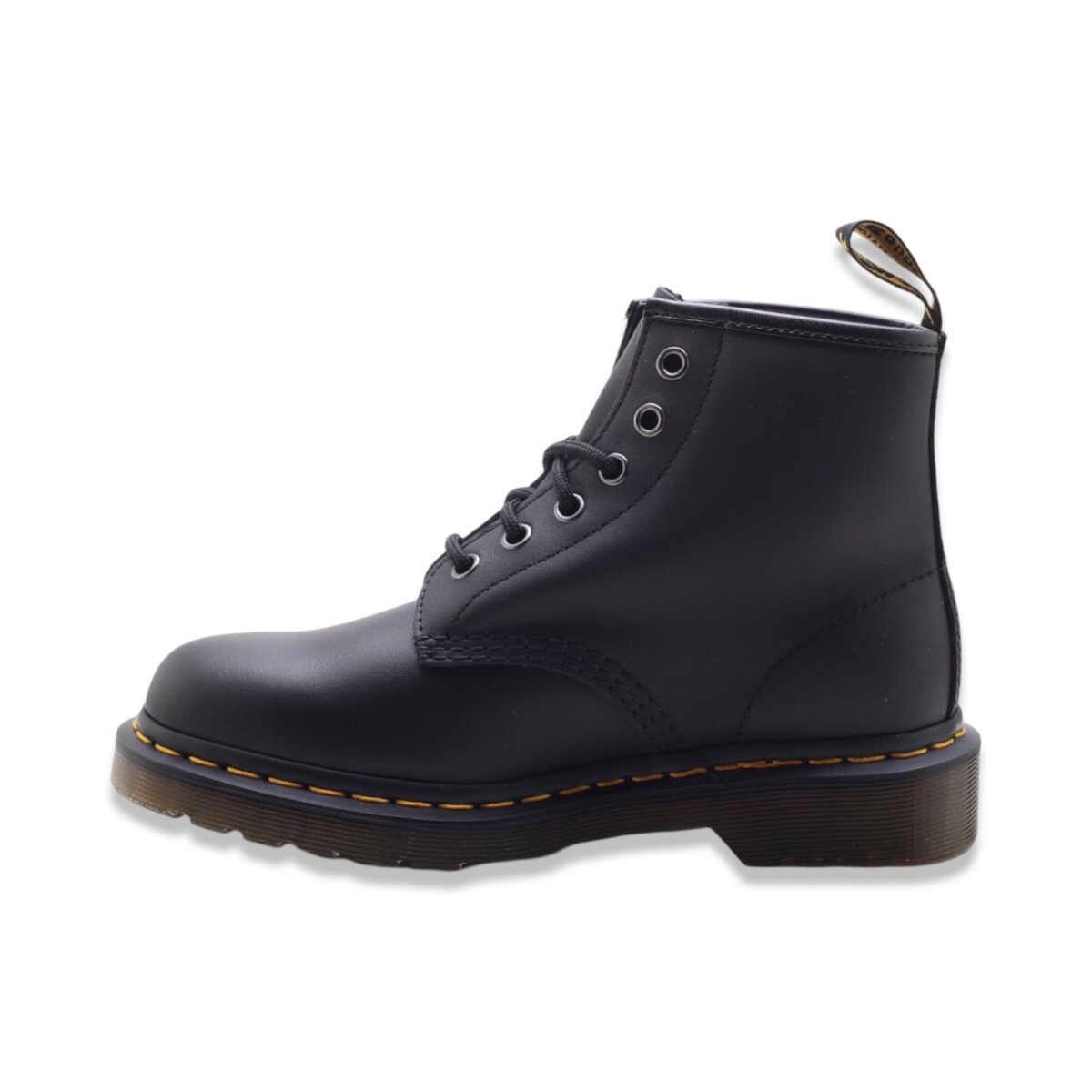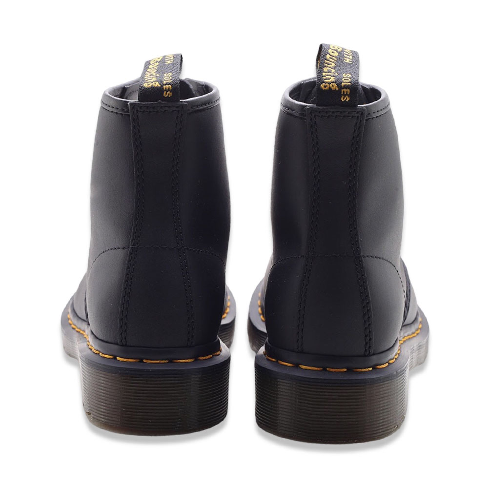 Dr. Martens 101 nappa Black. Pelle morbida con una finitura opaca e 6 occhielli. Bordi scanalati, fettuccia posteriore con logo e suola a cuscinetto.