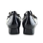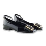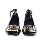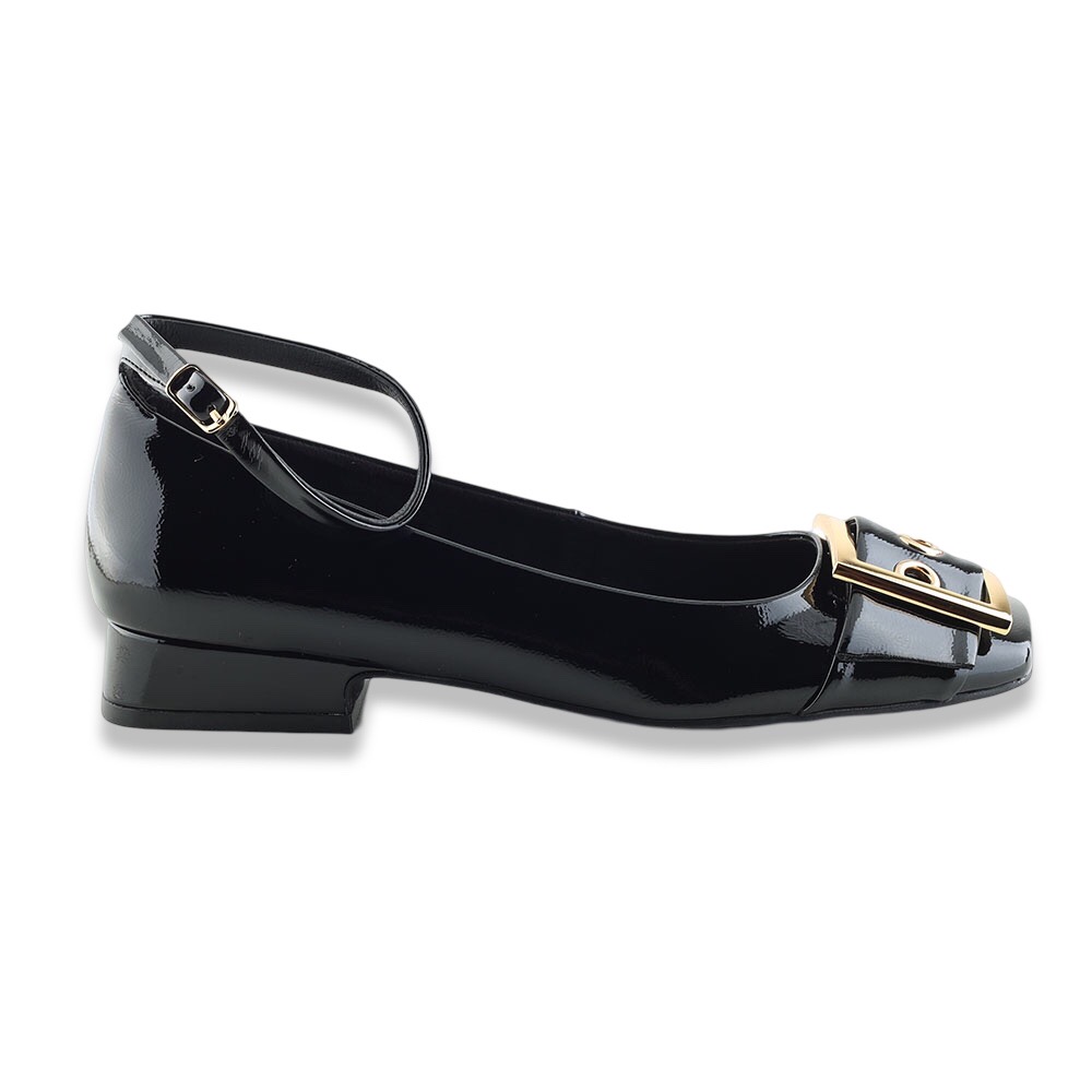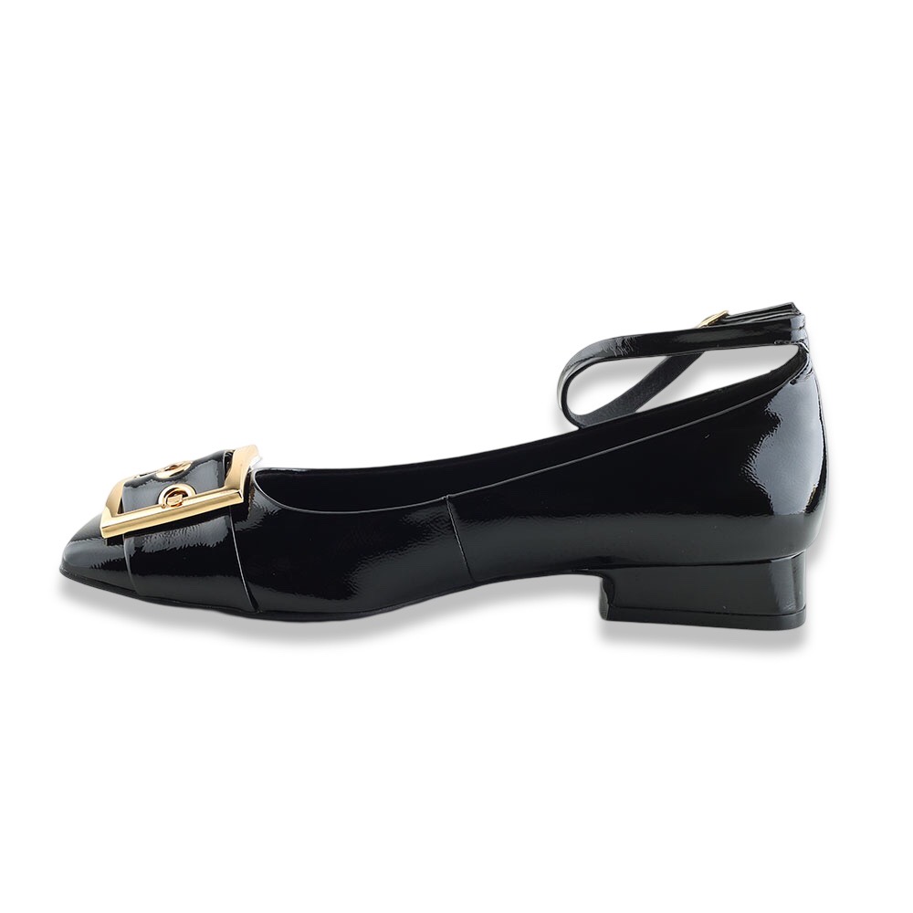 Ballerina molto particolore con un leggero tacco, punta squadrata con fibbia big colo oro e cinturino alla caviglia regolabile.  Tomaia in vernice, fodera in tessuto, soletta in pelle e suola in gomma.