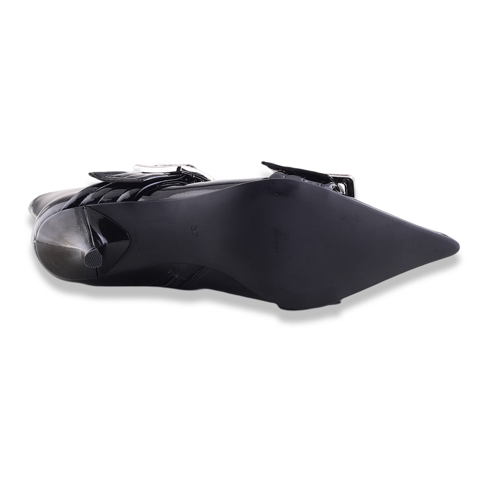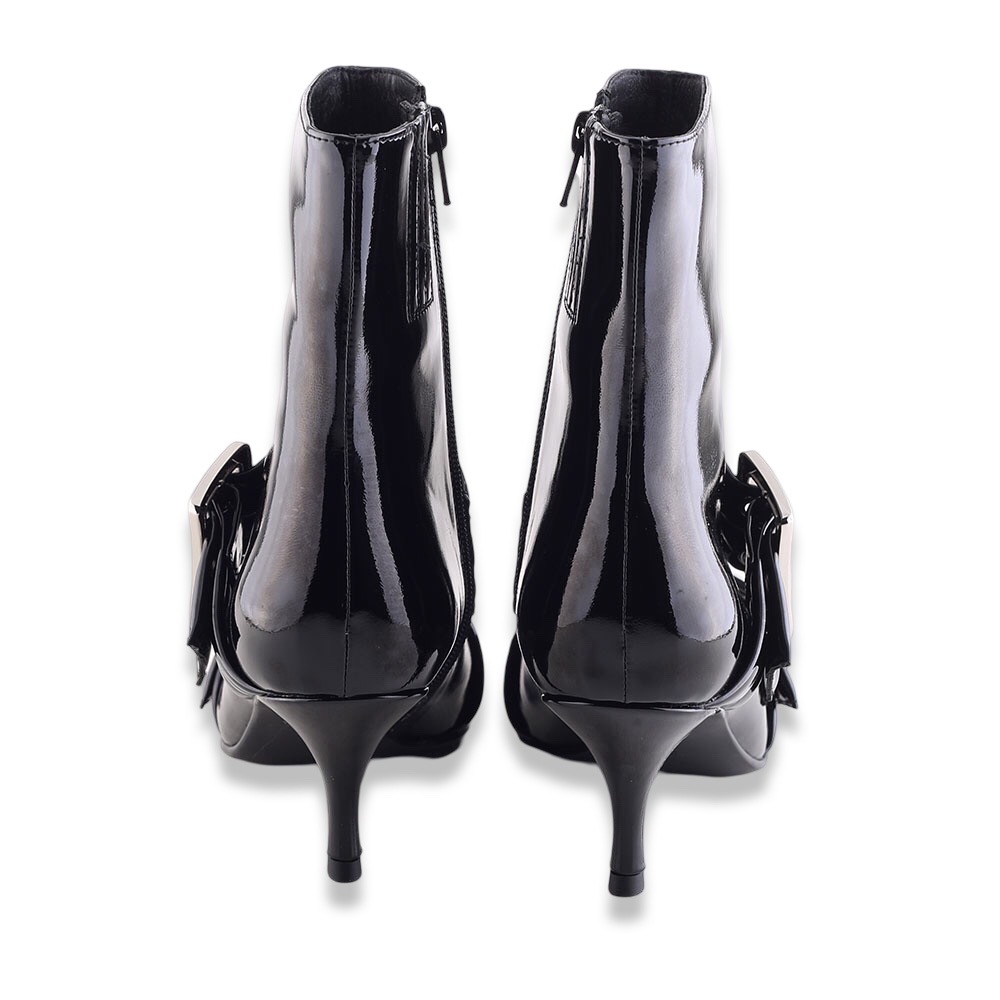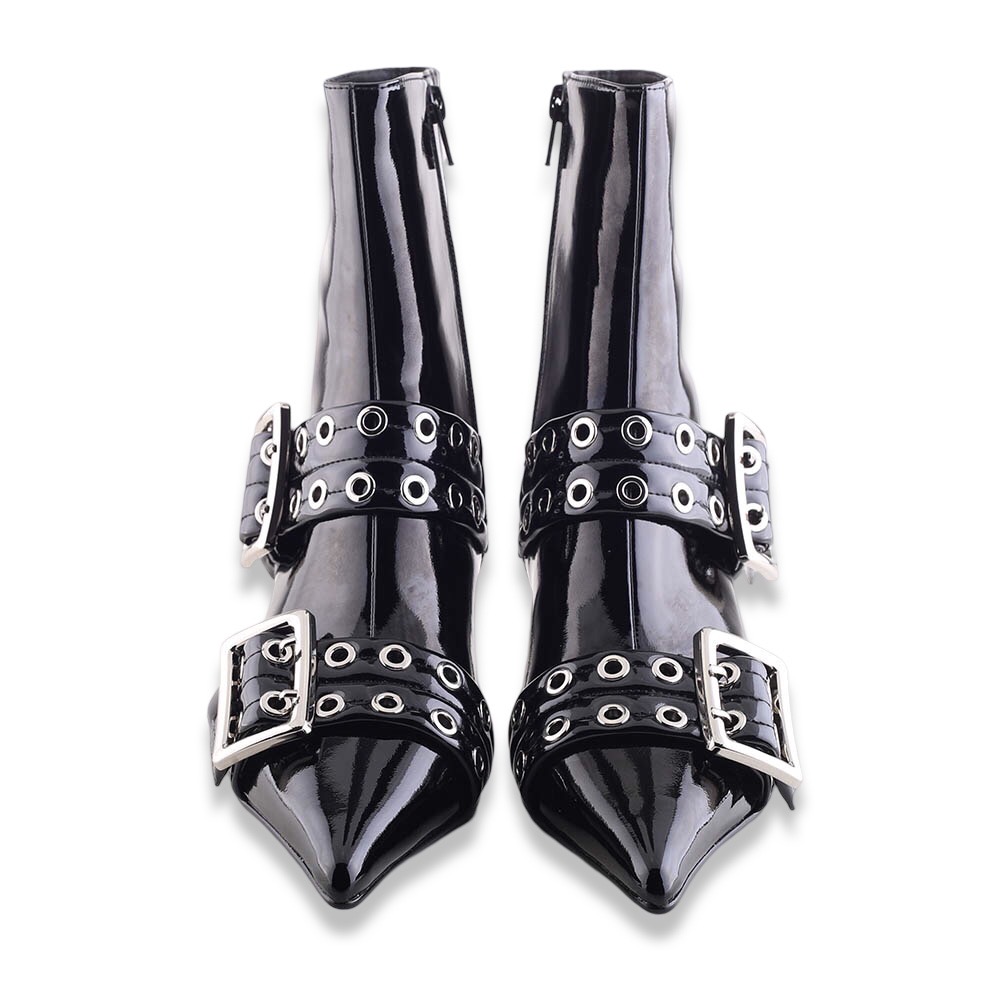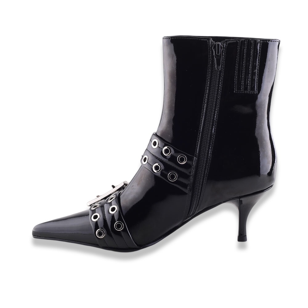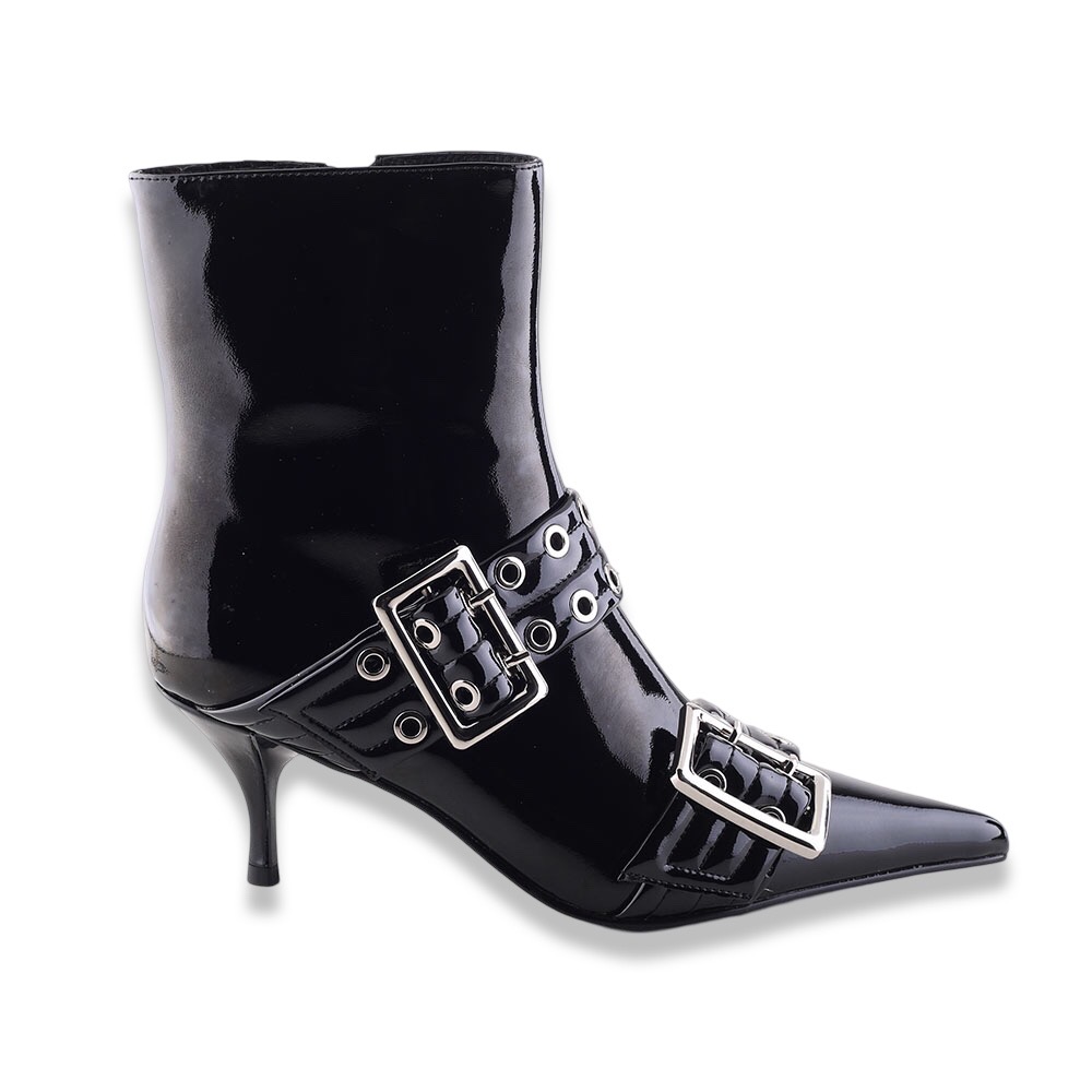 Tronchetto rock super grintoso con cerniera interna e fibbie big regolabili. Tomaia in vernice con interno in sintetico e fondo in tunit.