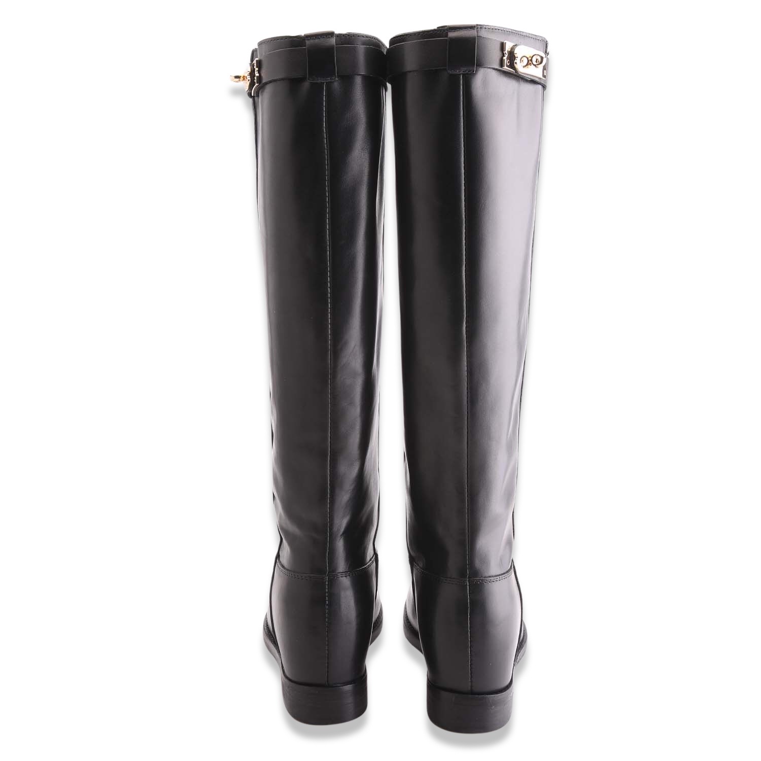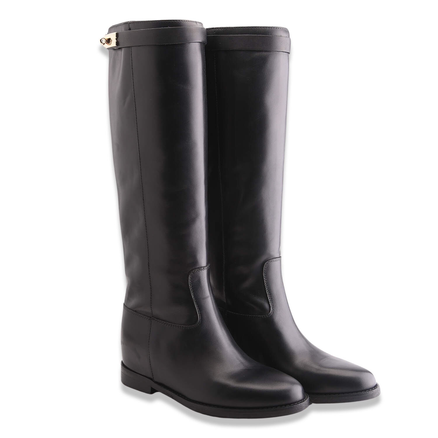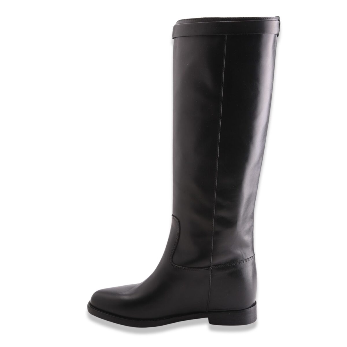 Stivale in pelle con gambale tubolare, zeppa interna di 4 cm e fettuccia estraibile con chiusura color oro. Sottopiede in pelle e fondo in gomma. Made in Italy