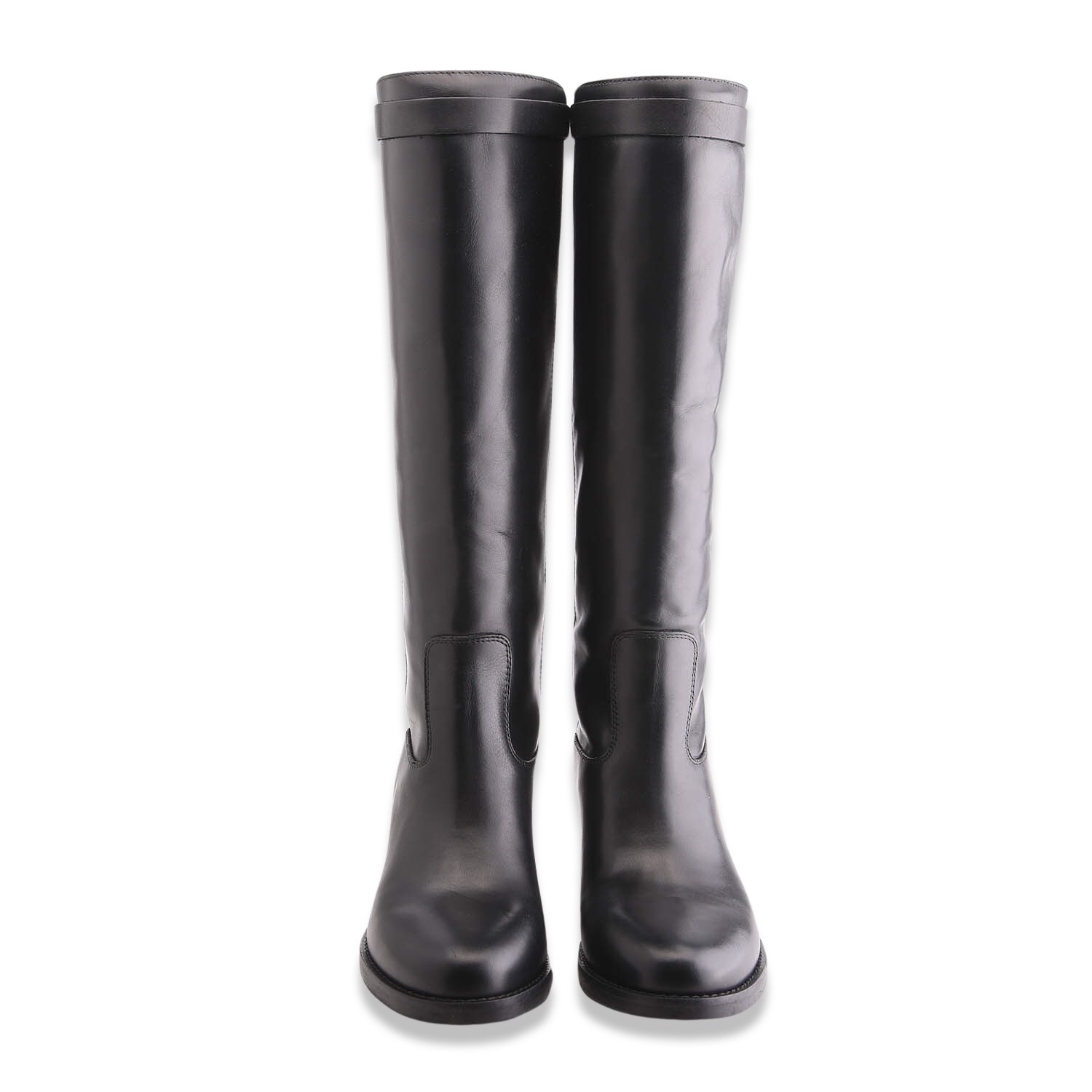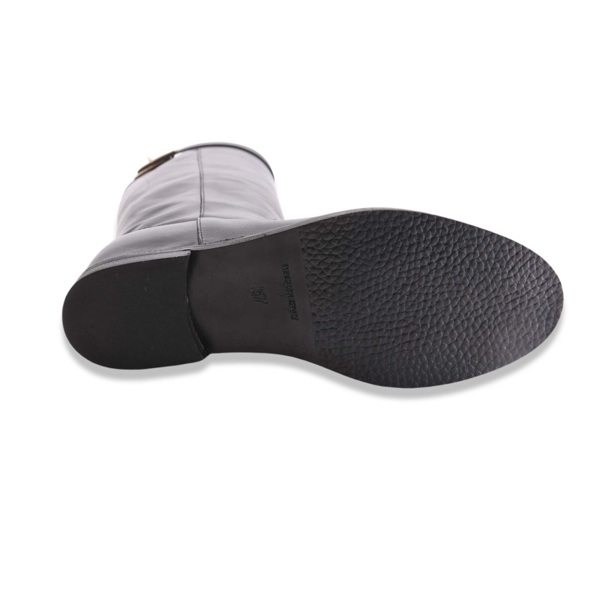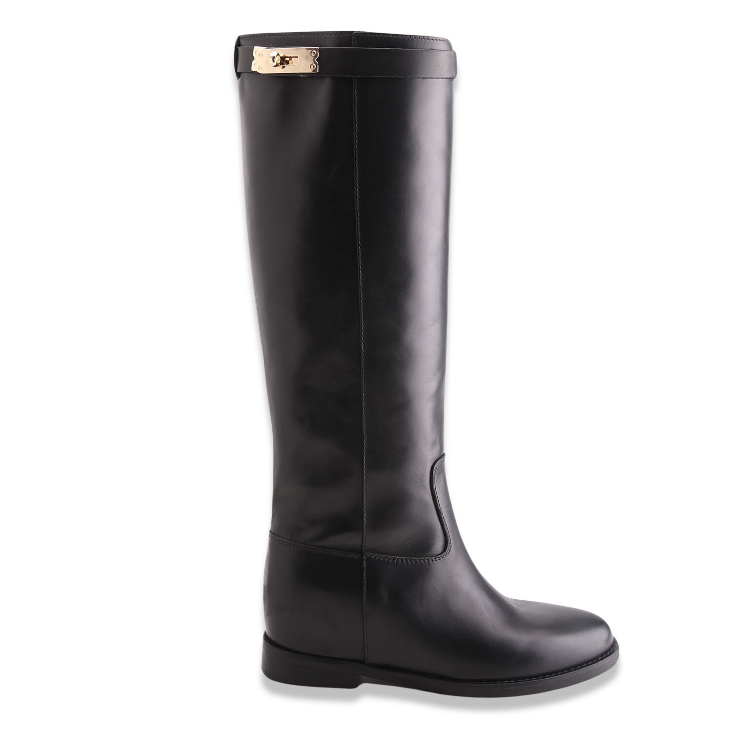 Stivale in pelle con gambale tubolare, zeppa interna di 4 cm e fettuccia estraibile con chiusura color oro. Sottopiede in pelle e fondo in gomma. Made in Italy