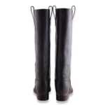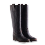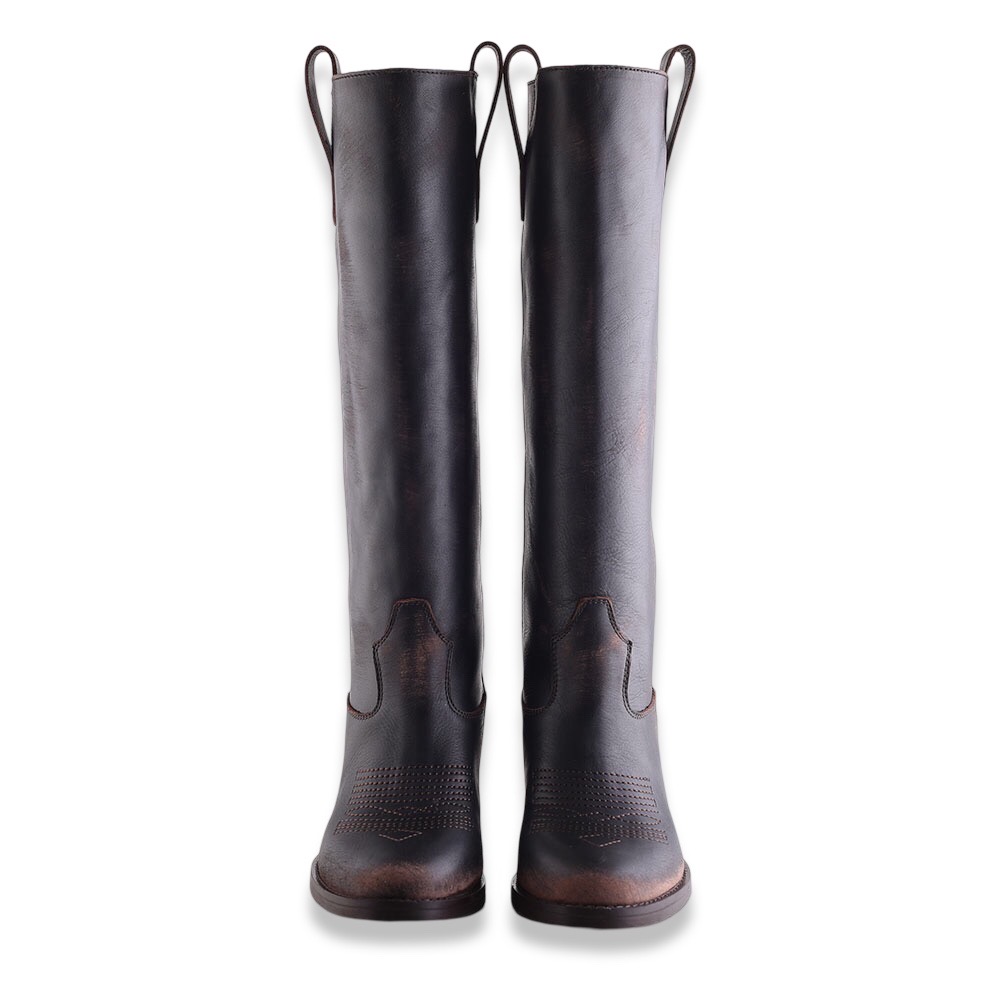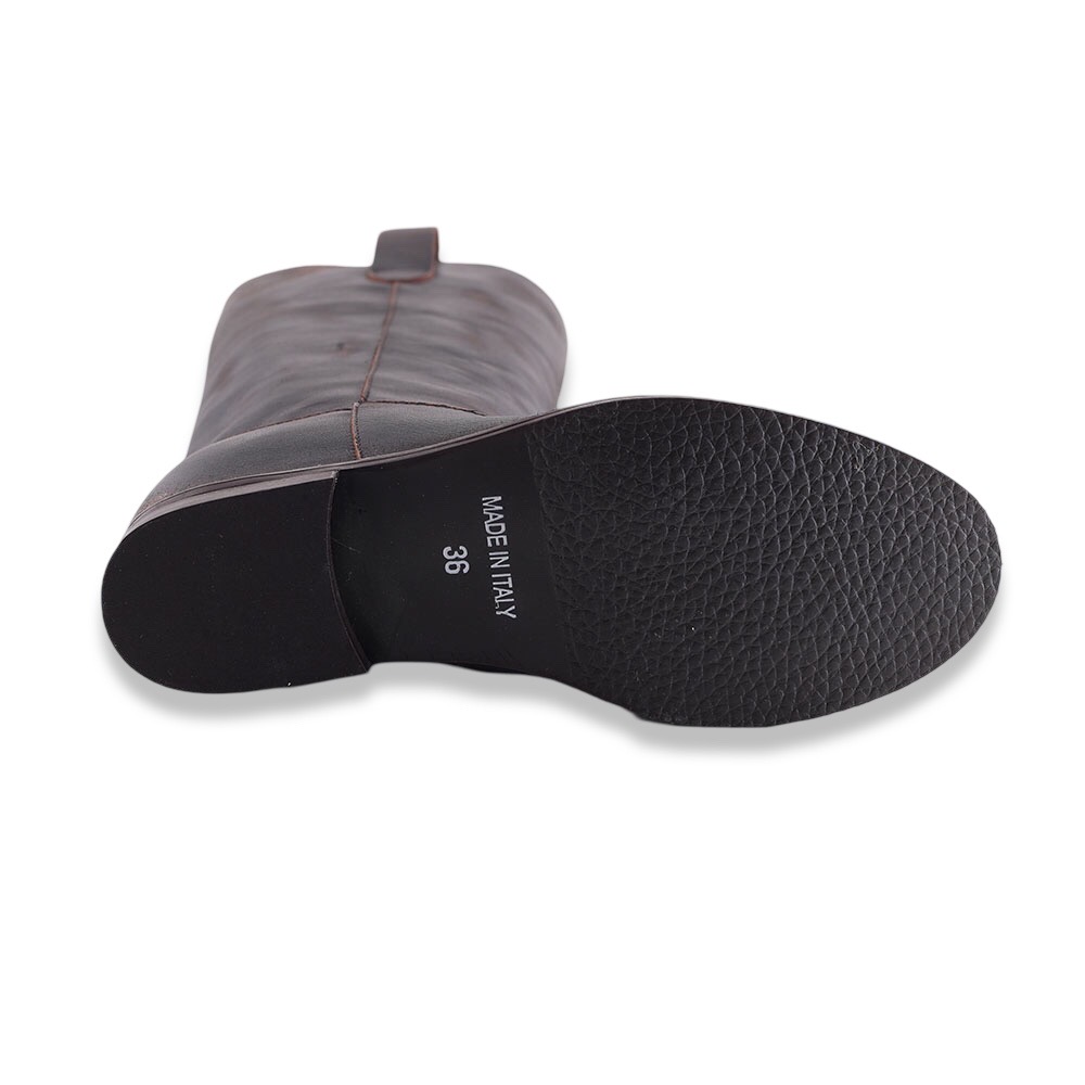 Stivale in pelle slavata cuoio con zeppa interna e gambale tubolare. Passanti al lati per facilitare la calzata e ricami in tinta sul piede. Fondo in gomma. Made in Italy