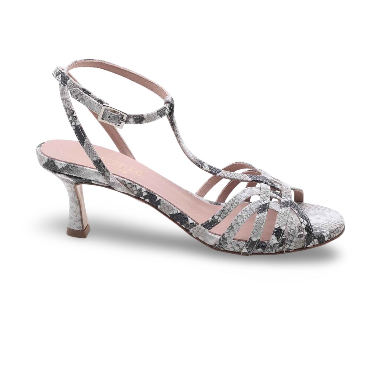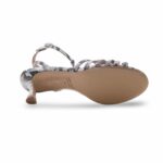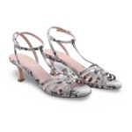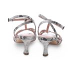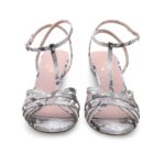 Il tacco a rocchetto medio dona slancio alla silhouette senza rinunciare alla stabilità, mentre le fascette intrecciate avvolgono il piede con sensualità e leggerezza. Il cinturino alla caviglia regolabile completa la calzata con eleganza e sicurezza.