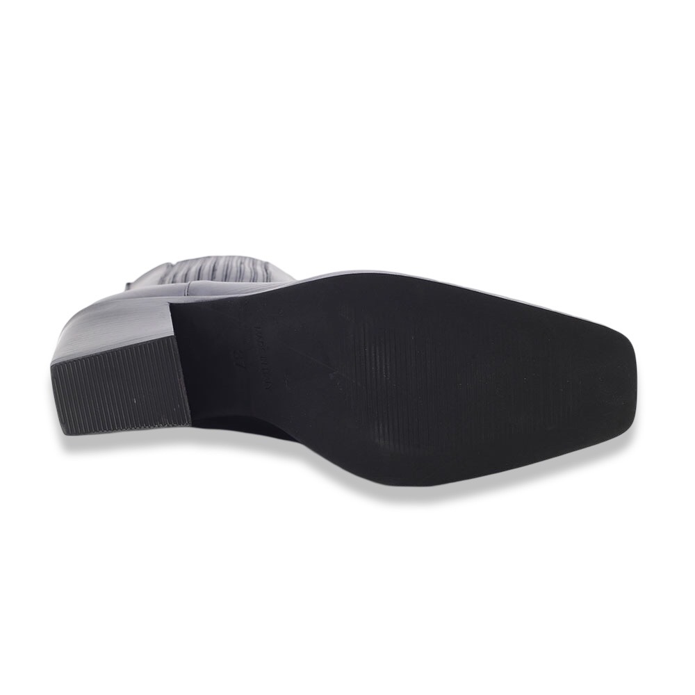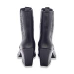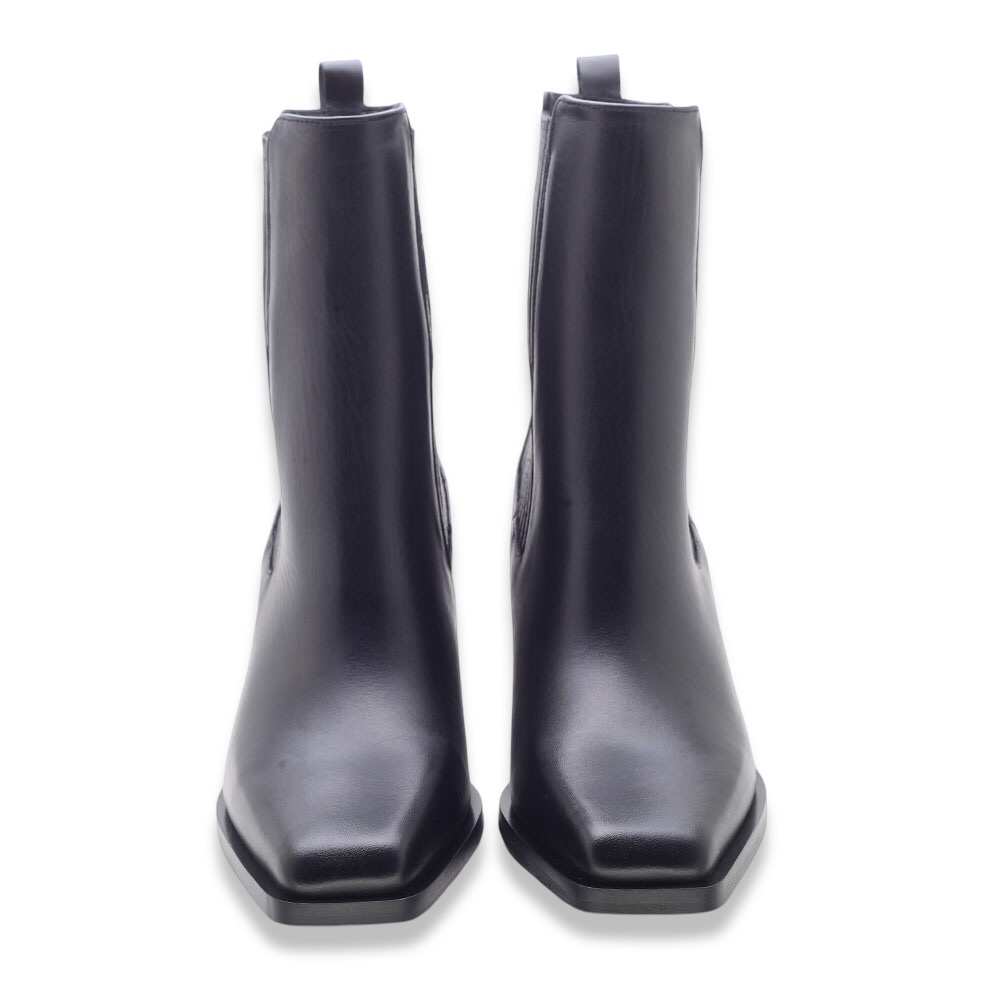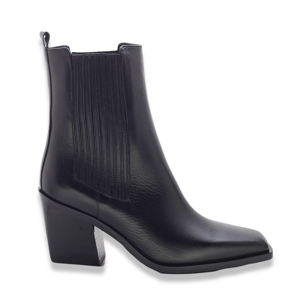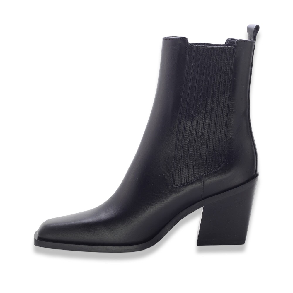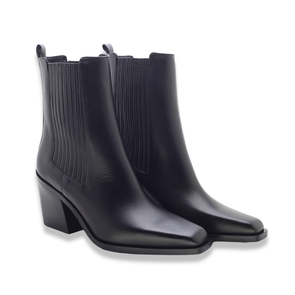 Minimalismo ed eleganza si uniscono in questi stivaletti Chelsea in pelle nera, perfetti per affrontare la stagione con stile e comodità. Il design affusolato con punta leggermente squadrata e il tacco largo donano un look sofisticato e contemporaneo.