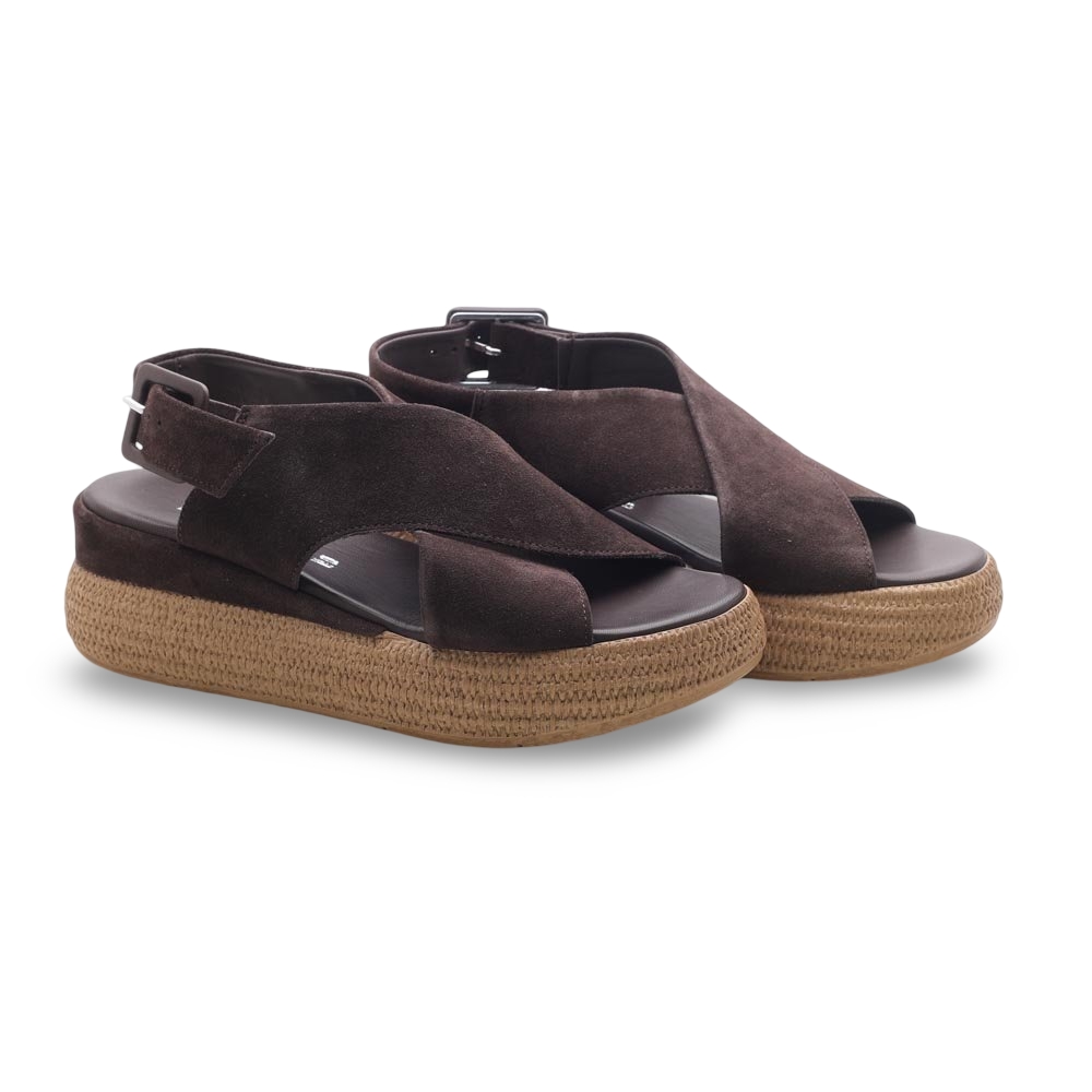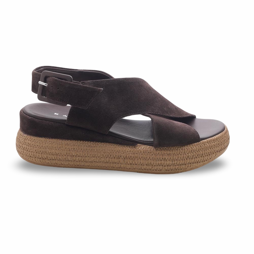 👡 Fasce incrociate in morbida pelle scamosciata, avvolgenti e raffinate, nella calda tonalità moro.