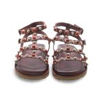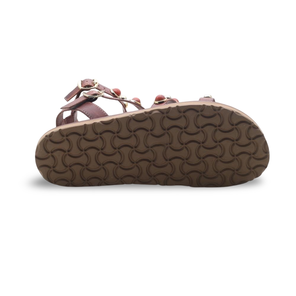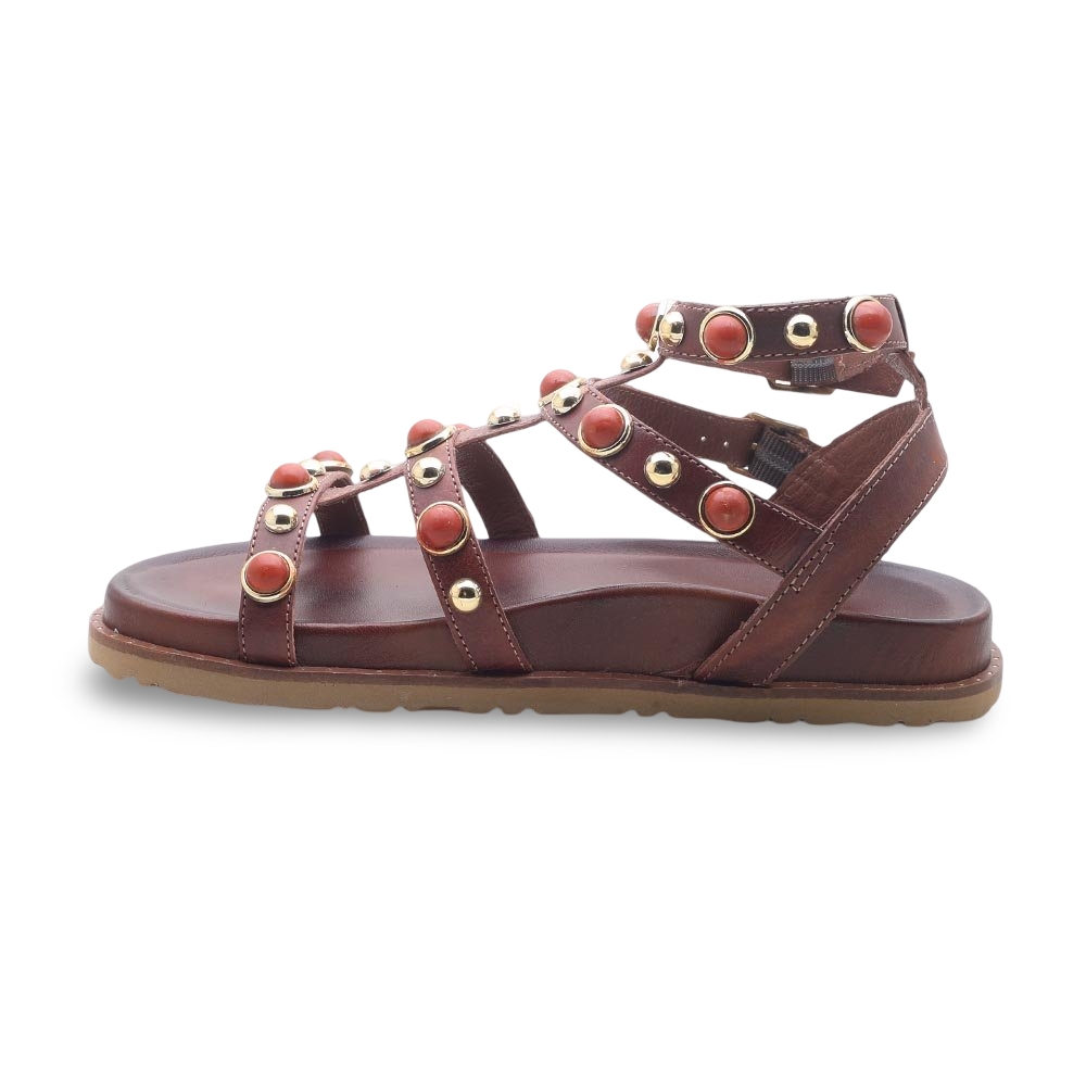 ✨ Struttura ispirata ai sandali gladiatore, con cinturini multipli impreziositi da applicazioni gioiello tonde in color corallo e dettagli dorati.