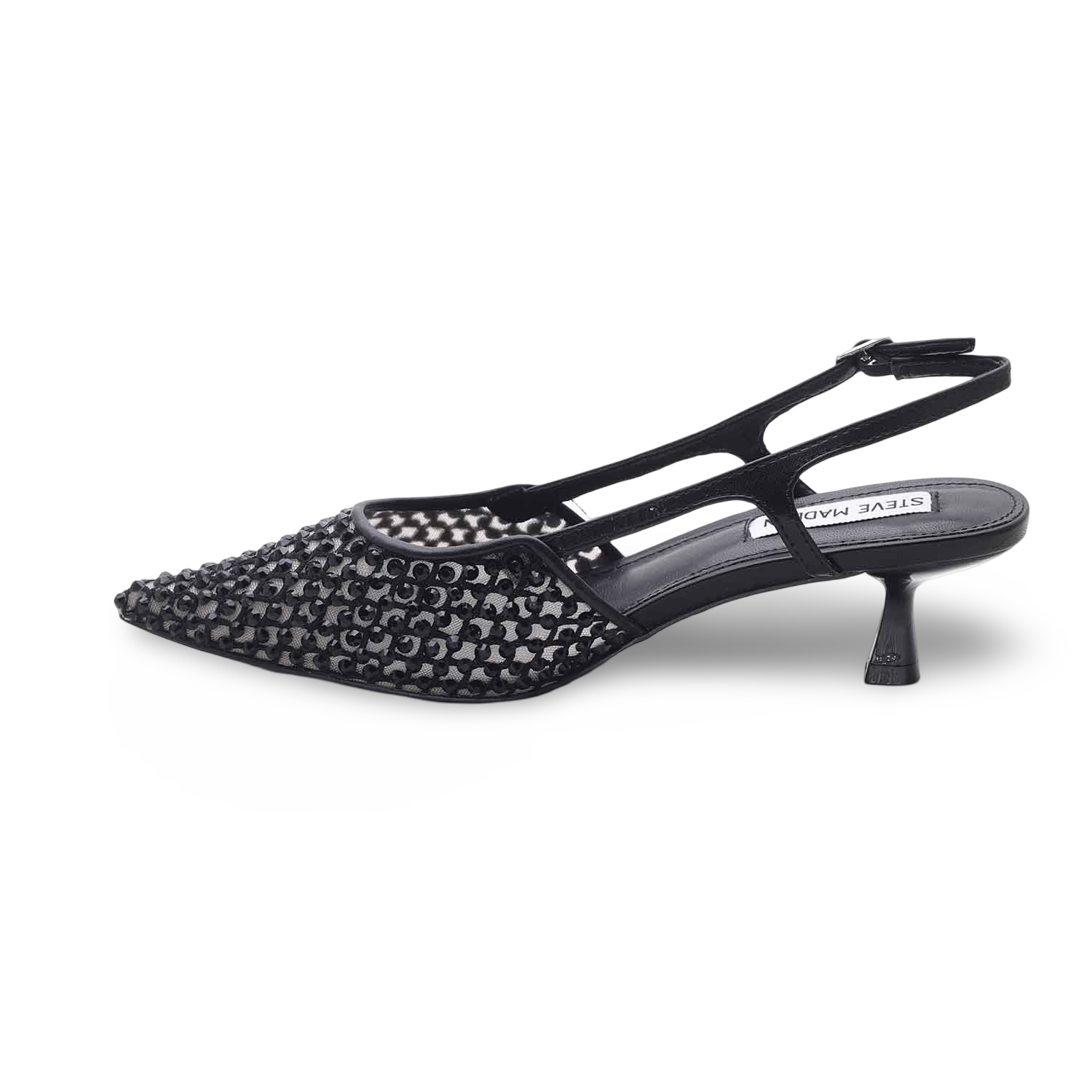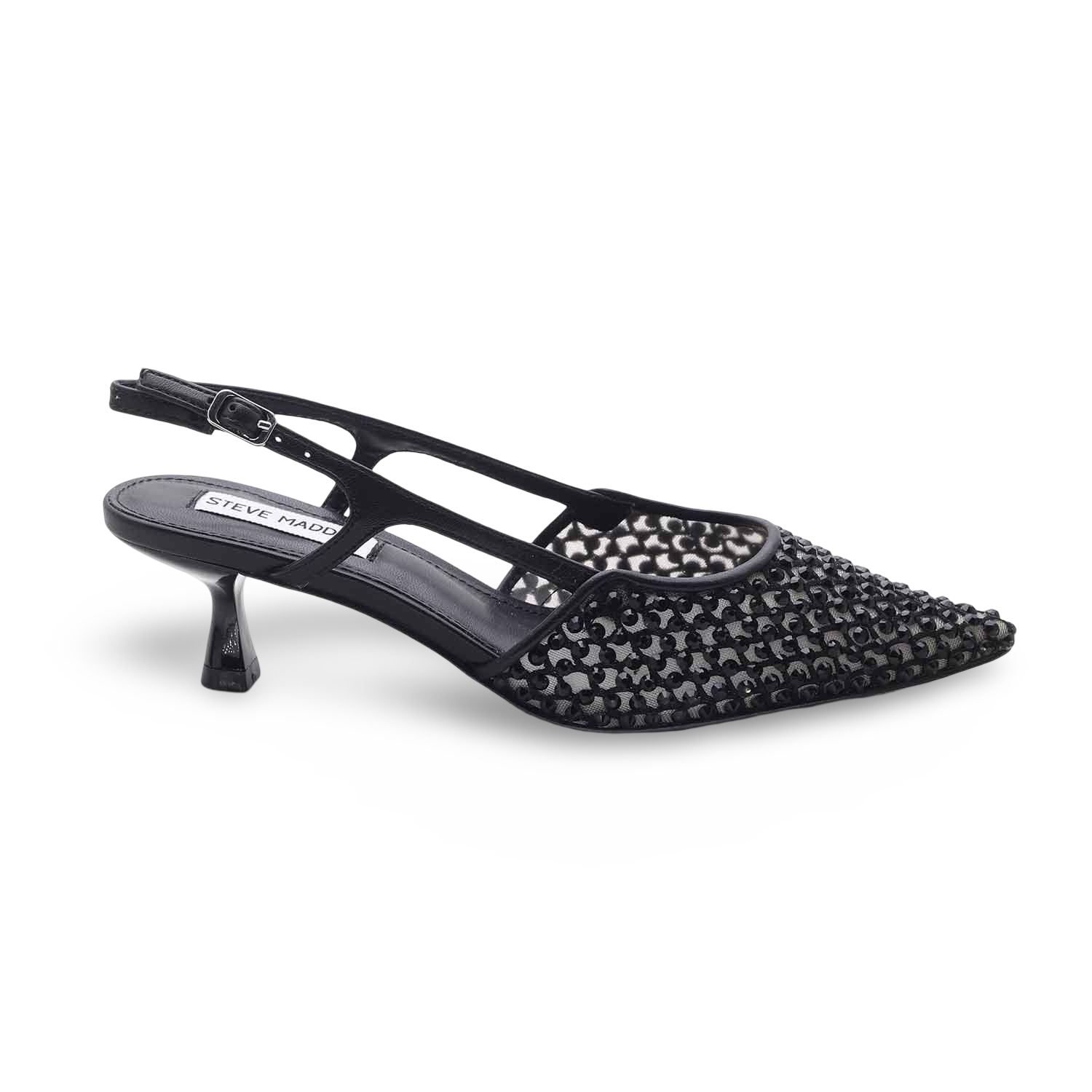 Minimalismo sofisticato e sensualità urbana si incontrano in queste décolleté Steve Madden, pensate per la donna che desidera distinguersi senza rinunciare alla comodità. Il design slingback con cinturino regolabile esalta la silhouette del piede, mentre il tessuto a rete impreziosito da cristalli neri aggiunge un tocco glam da passerella.