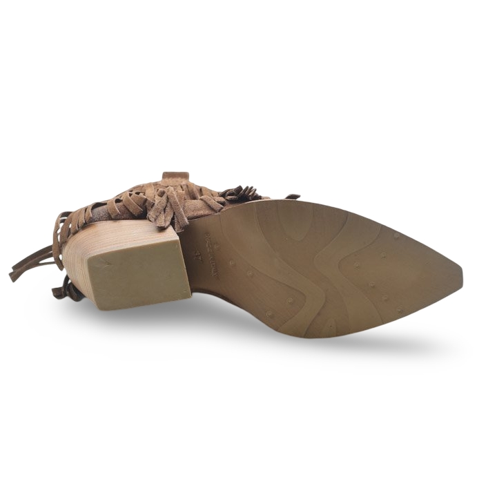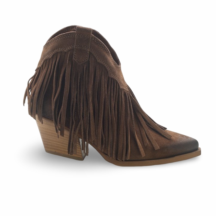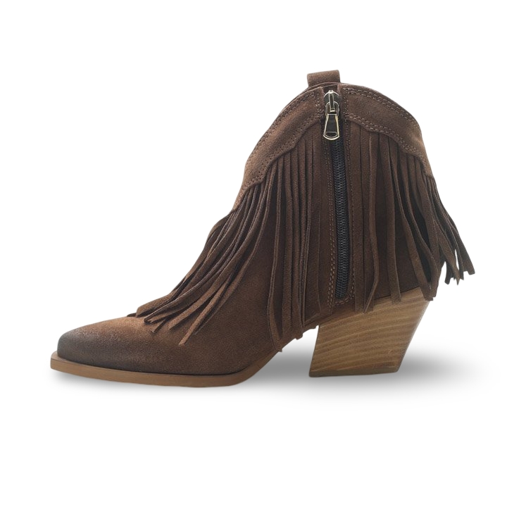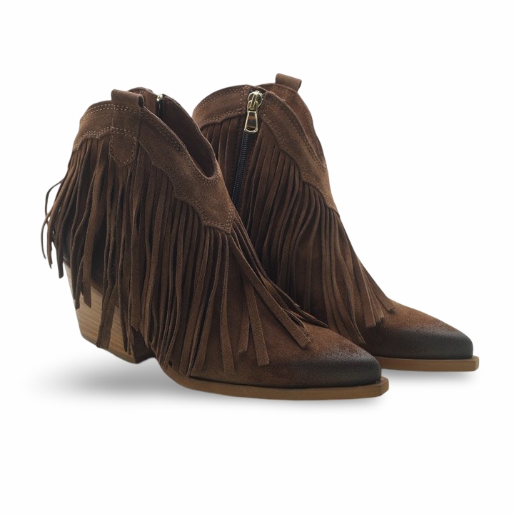 Scopri l’anima wild del tuo stile con questi eleganti stivaletti texani da donna con frange, perfetti per dare un tocco boho-chic ai tuoi look quotidiani. Realizzati in morbido camoscio marrone, questi ankle boots si distinguono per il loro design raffinato con frange laterali dinamiche e un leggero effetto sfumato sulla punta.