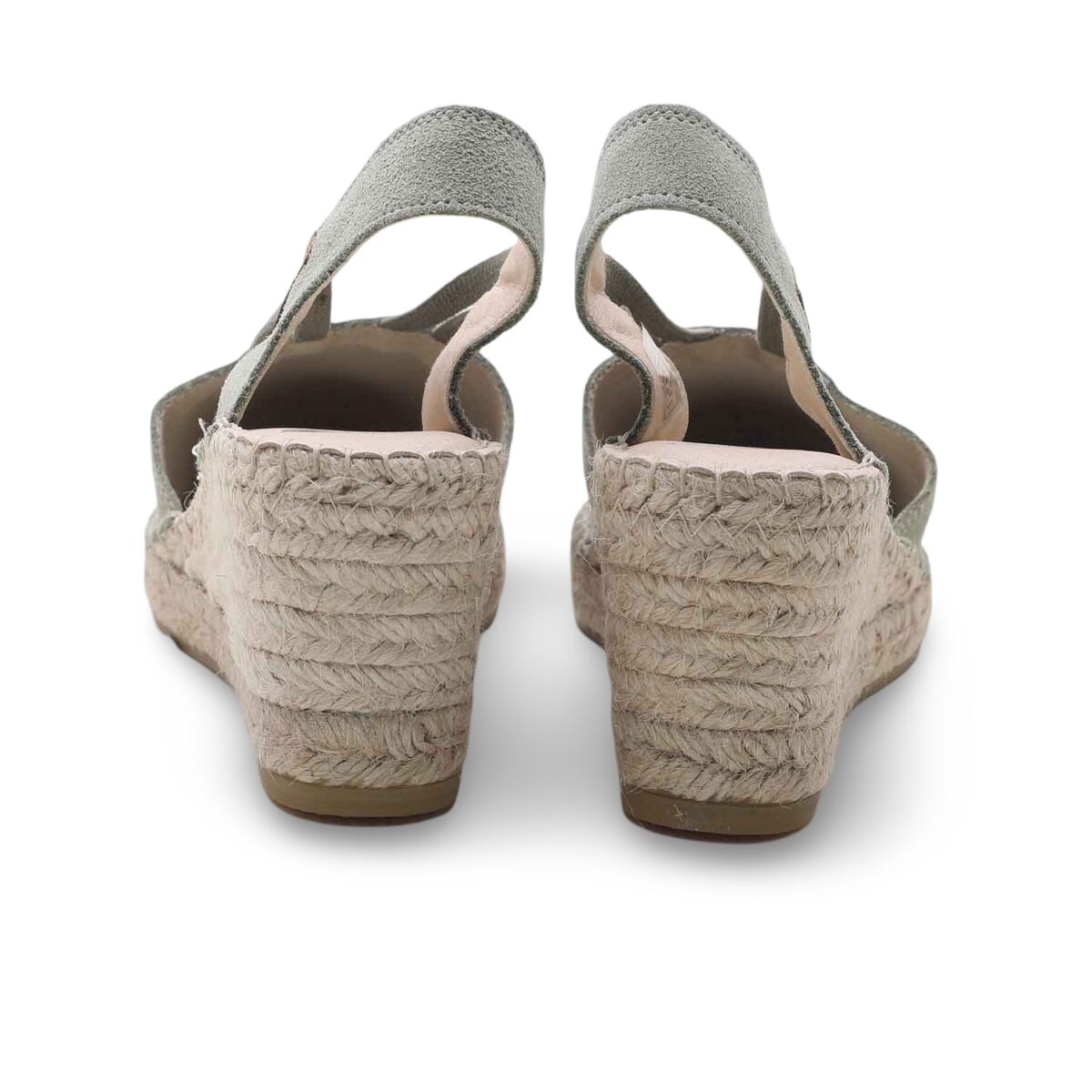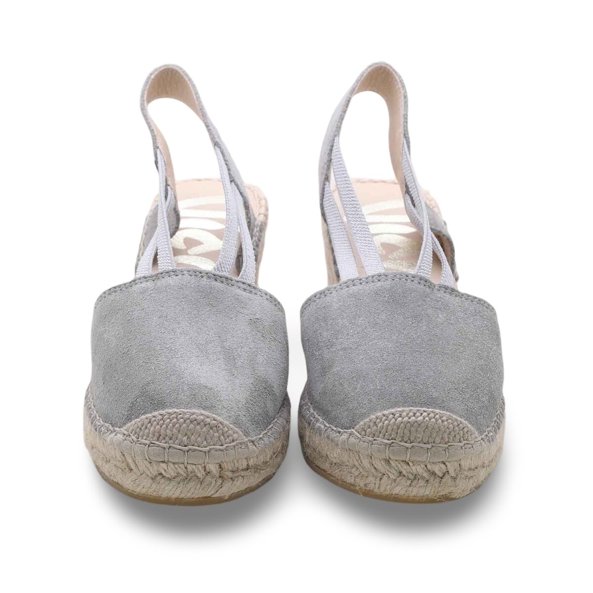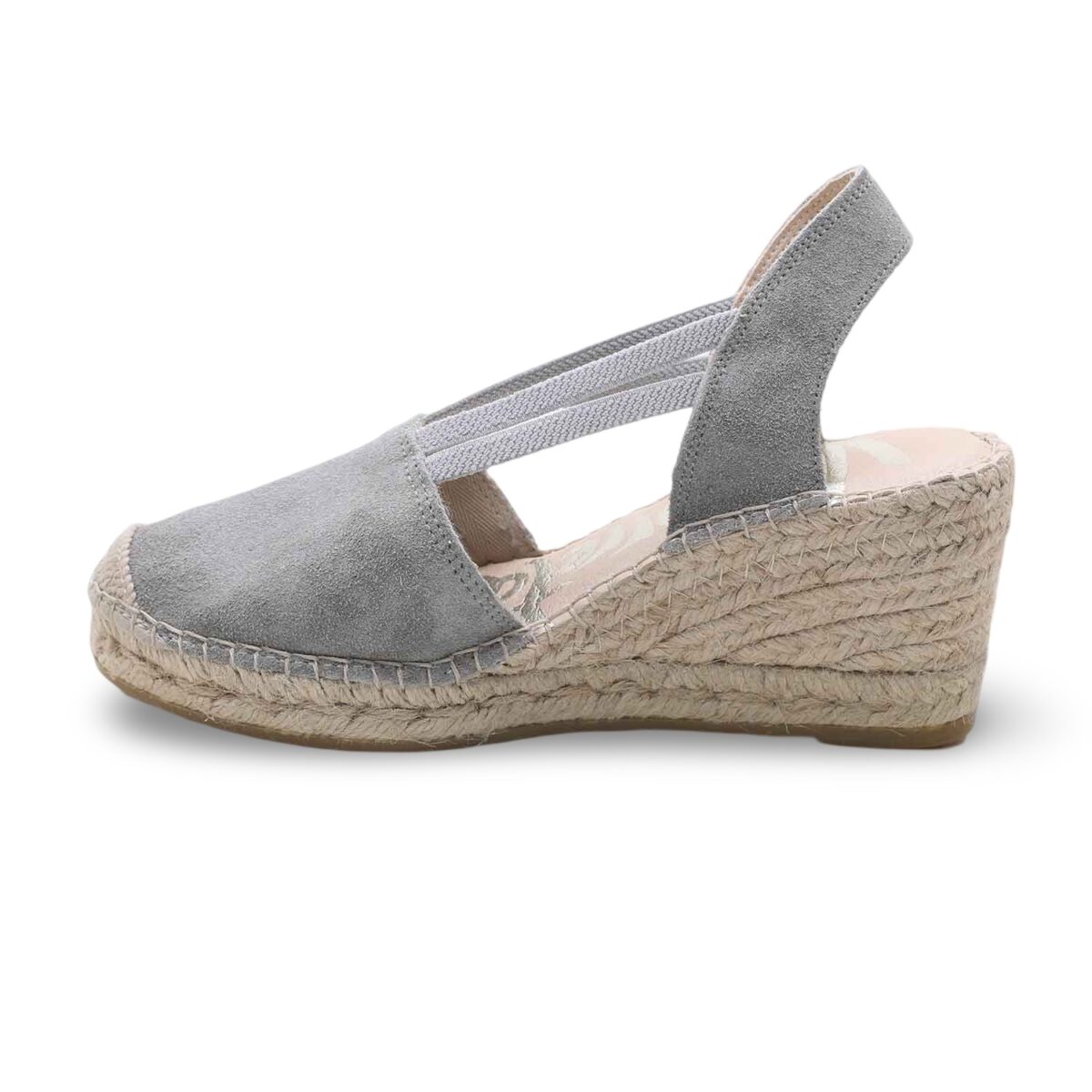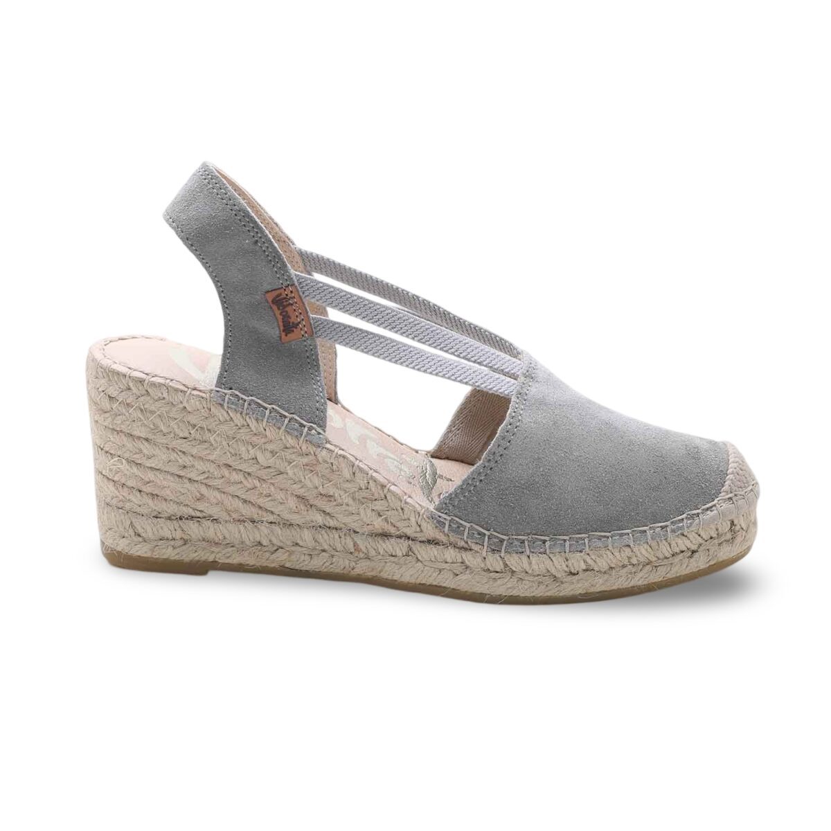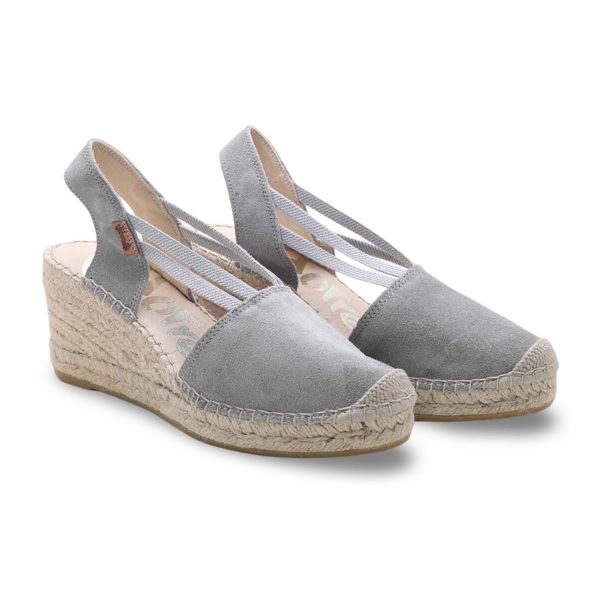 Le espadrillas Vidorreta con zeppa rappresentano il perfetto equilibrio tra tradizione artigianale e tendenza contemporanea. La tomaia in morbida pelle scamosciata grigia accarezza il piede con delicatezza, mentre gli elastici incrociati assicurano una tenuta perfetta e slanciano la silhouette.