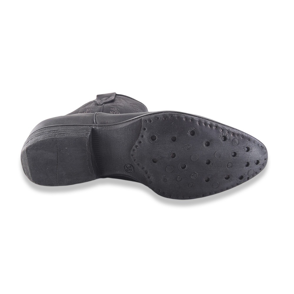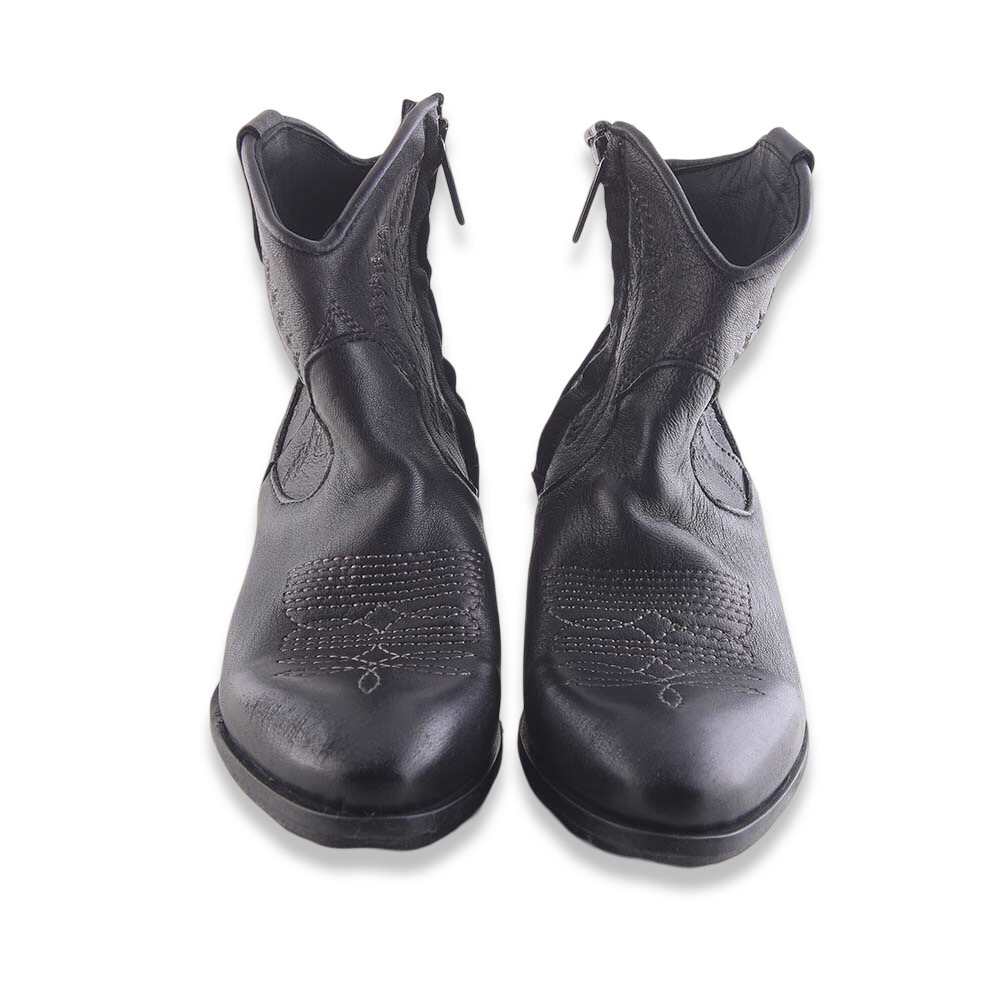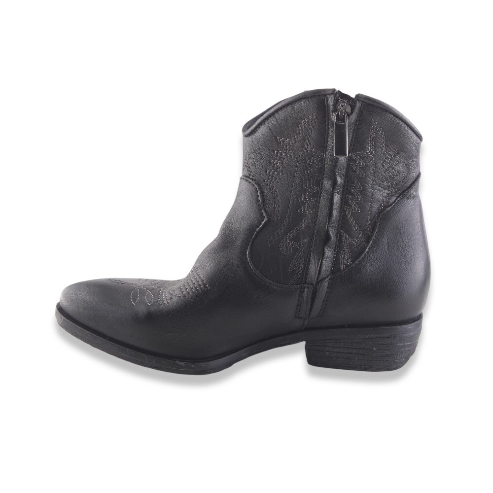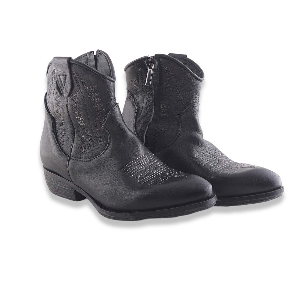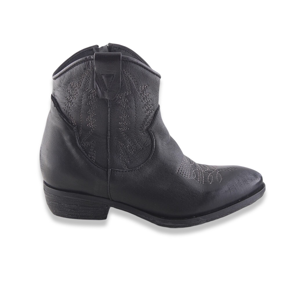 Texanino super grintoso in pelle spazzolata con ricami in contrasto di colore e cerniera laterale interna. Suola in gomma. Made in Italy.